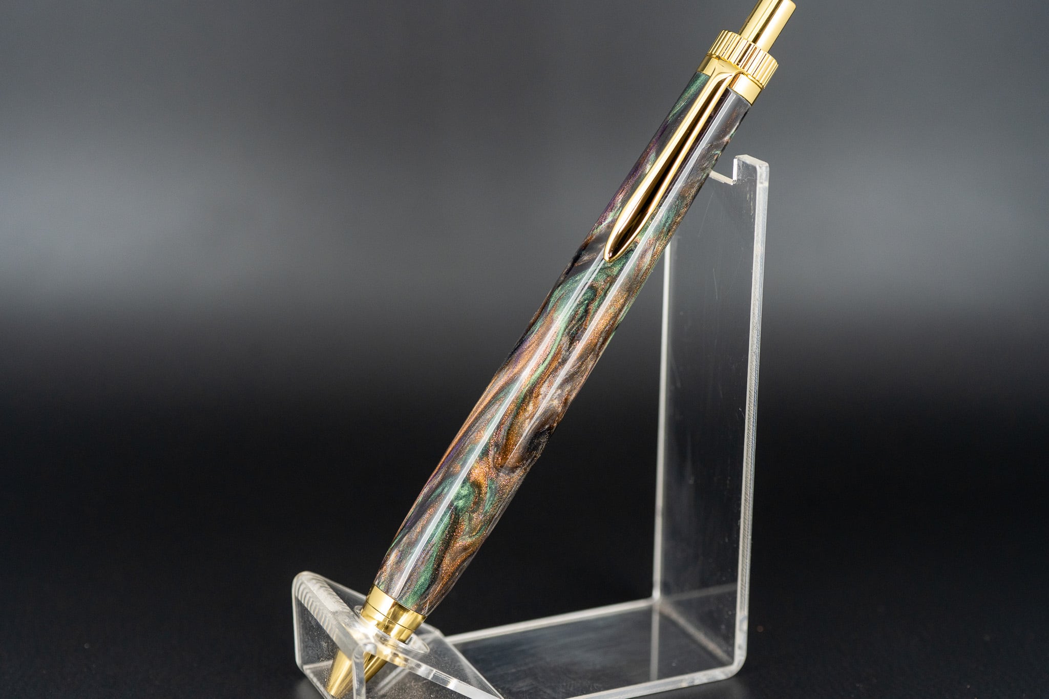 紫をベースに緑やオレンジが大きなマーブルを描く、煌めく銀河のような一本。