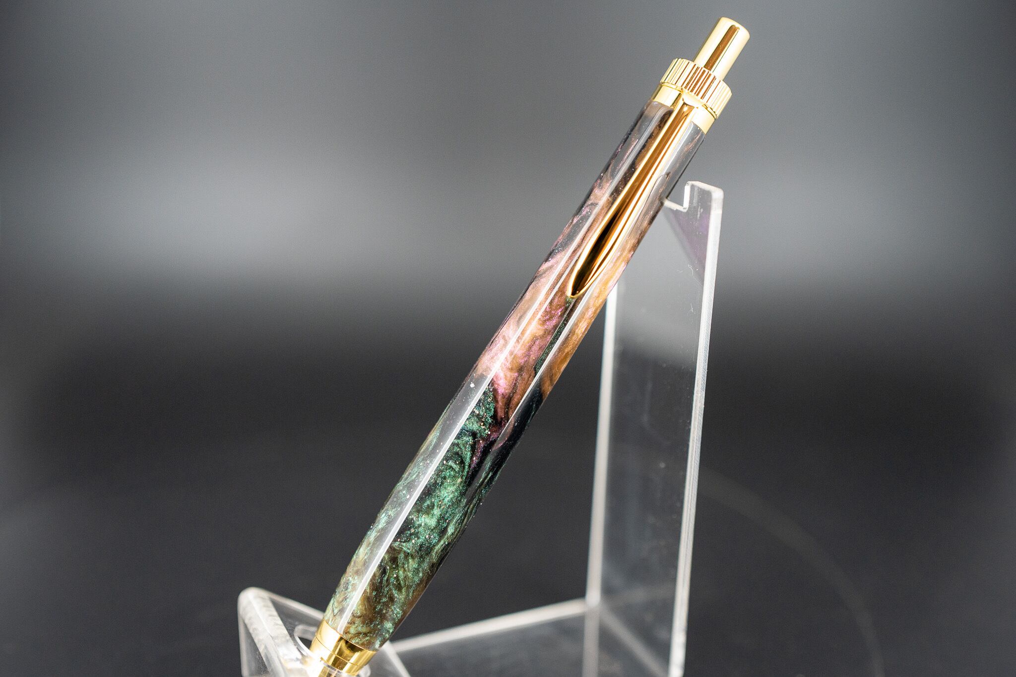 黒をベースに緑や紫が大きなマーブルを描く、煌めく銀河のような一本。