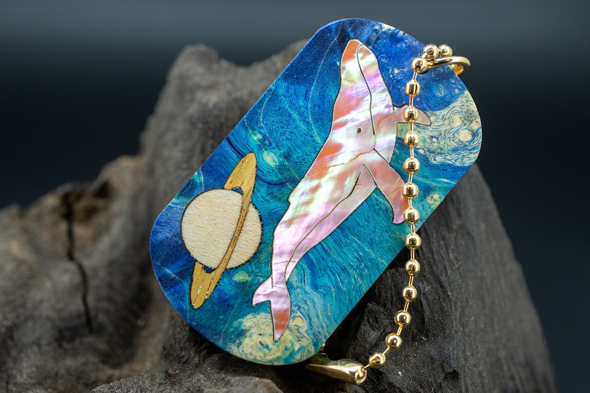 鮮やかなスタビライズドウッドを宇宙に見立て、土星のモチーフと共に表現しました。