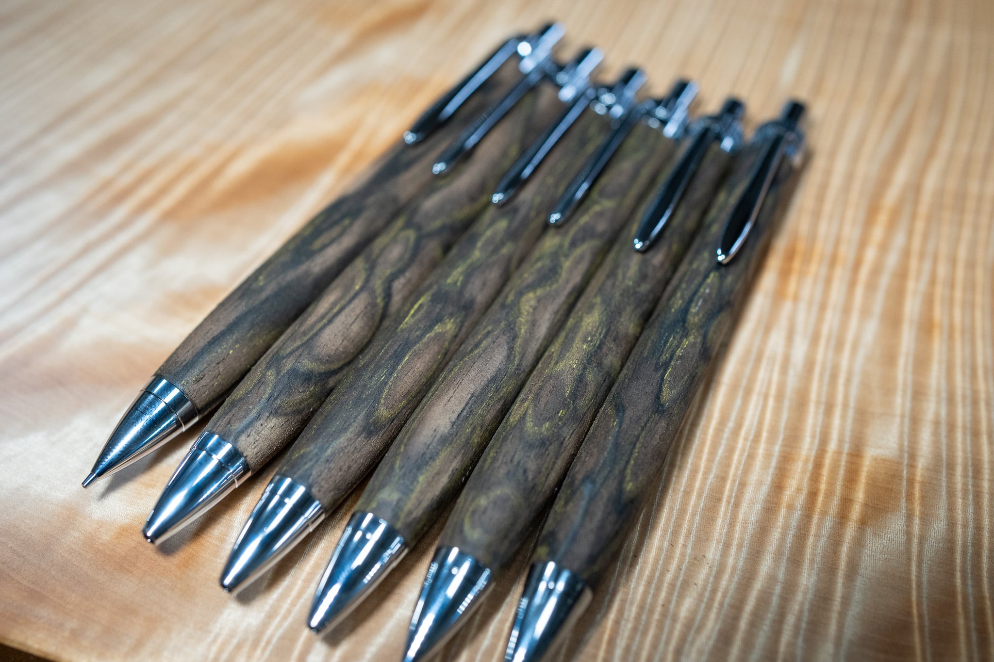 今回は、材木屋さんが秘蔵していた黒柿孔雀杢を特別に譲り受けました。