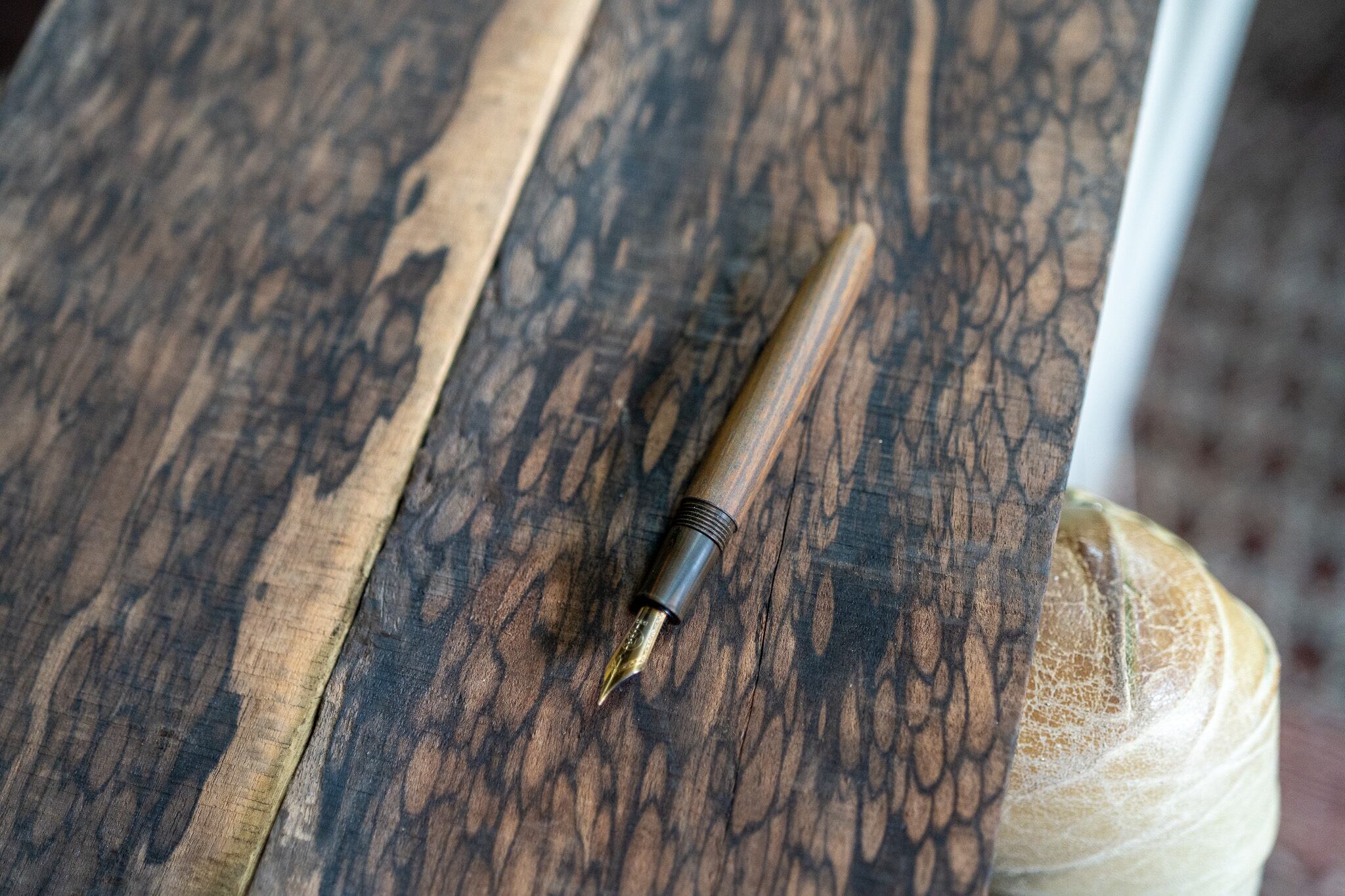 今回は、材木屋さんが秘蔵していた黒柿孔雀杢を特別に譲り受けました。