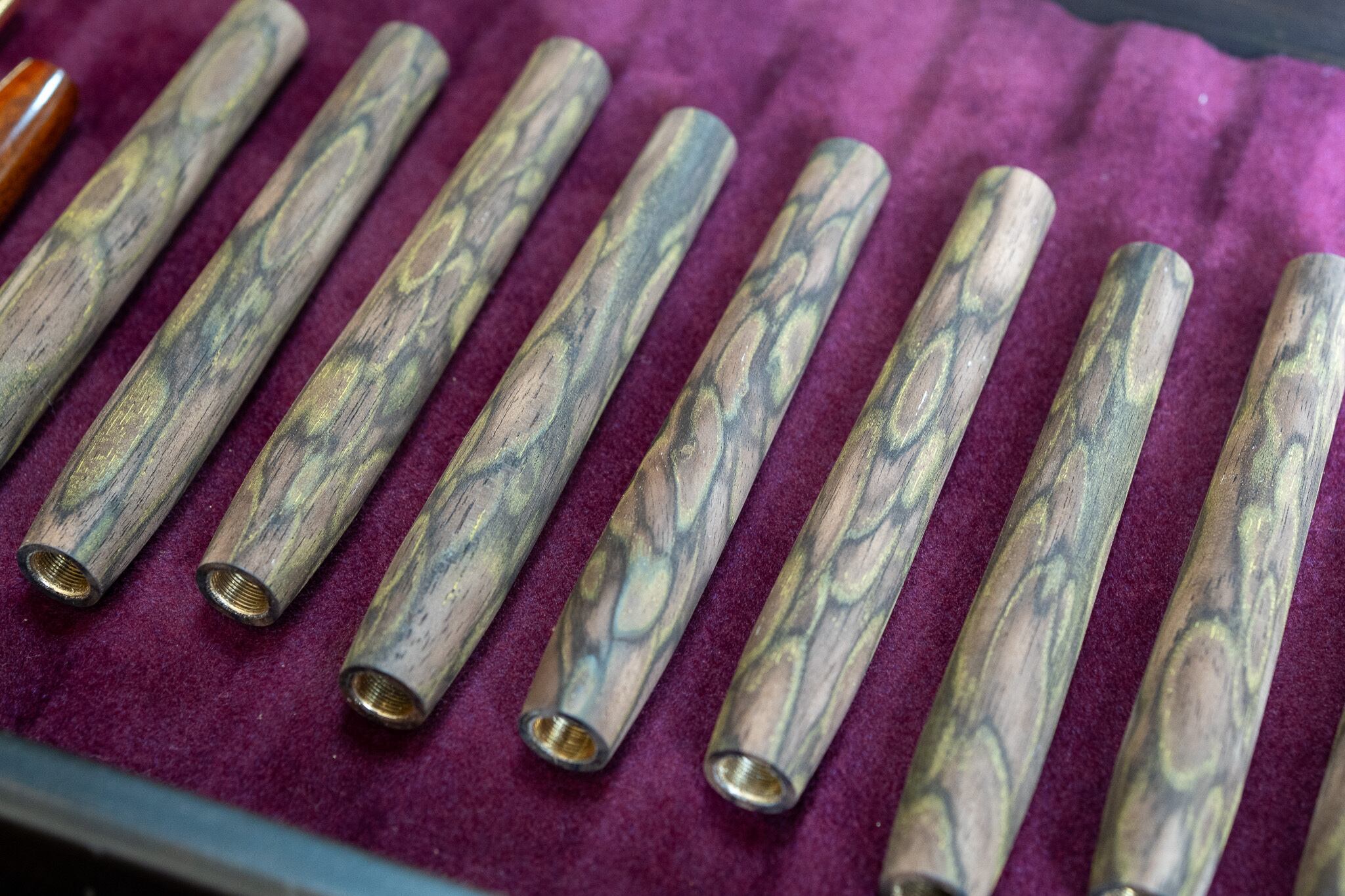 今回は、材木屋さんが秘蔵していた黒柿孔雀杢を特別に譲り受けました。