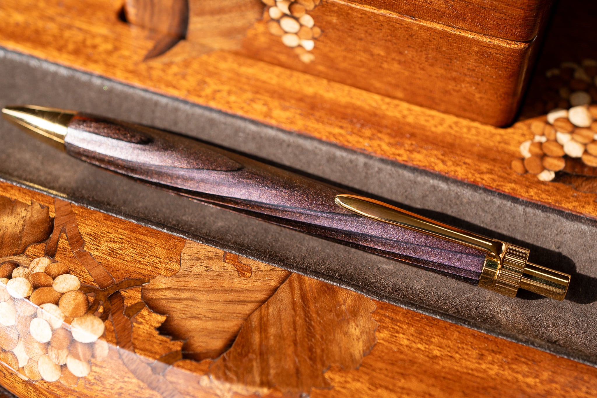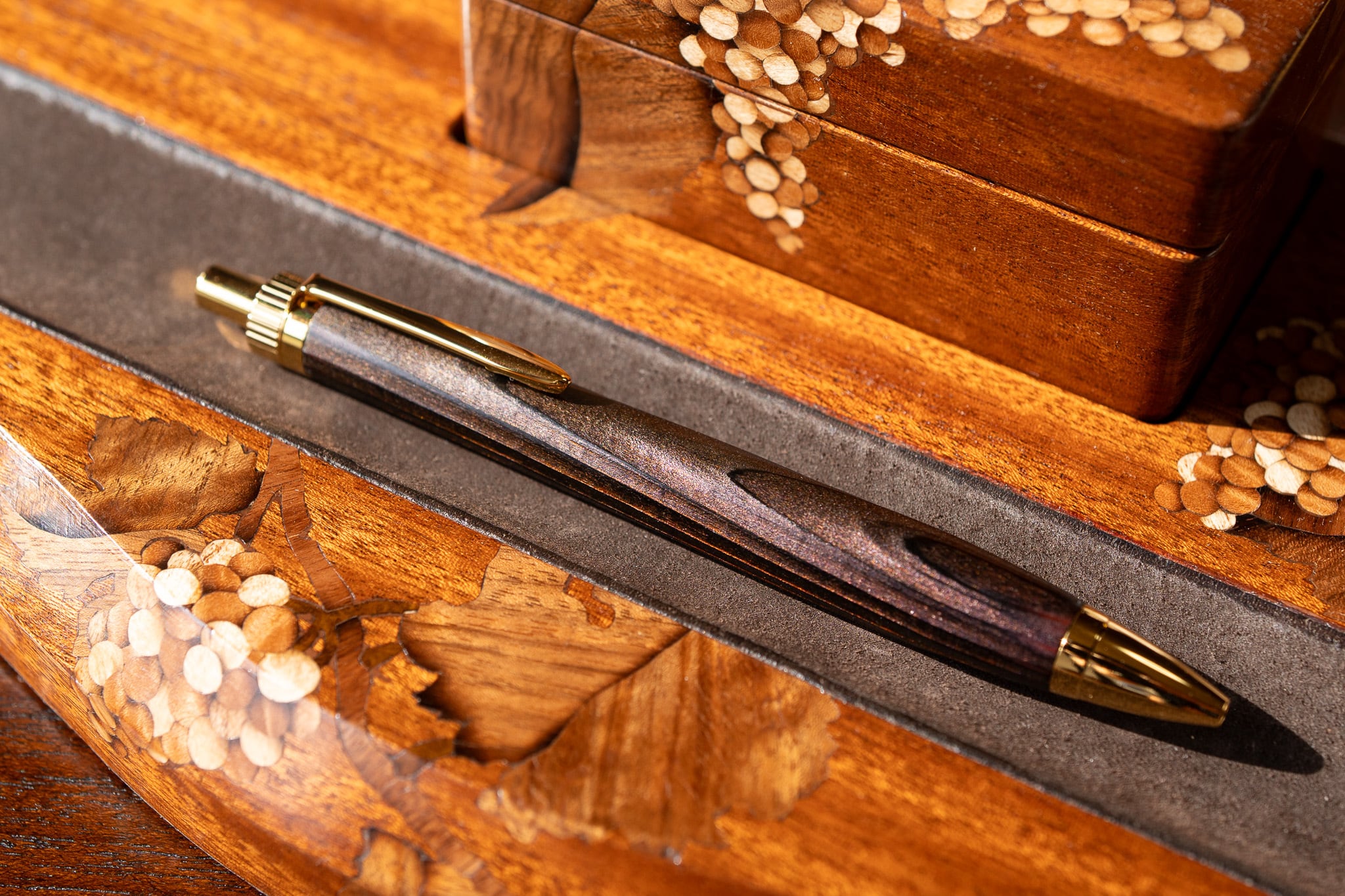 屋久杉の持つ木目の揺らぎと重なり、光の角度によってはどこか懐かしい秋の情景を映し出します。まるで山里にひっそりと実る葡萄の房を思わせるような、落ち着いた趣をお楽しみいただけます。