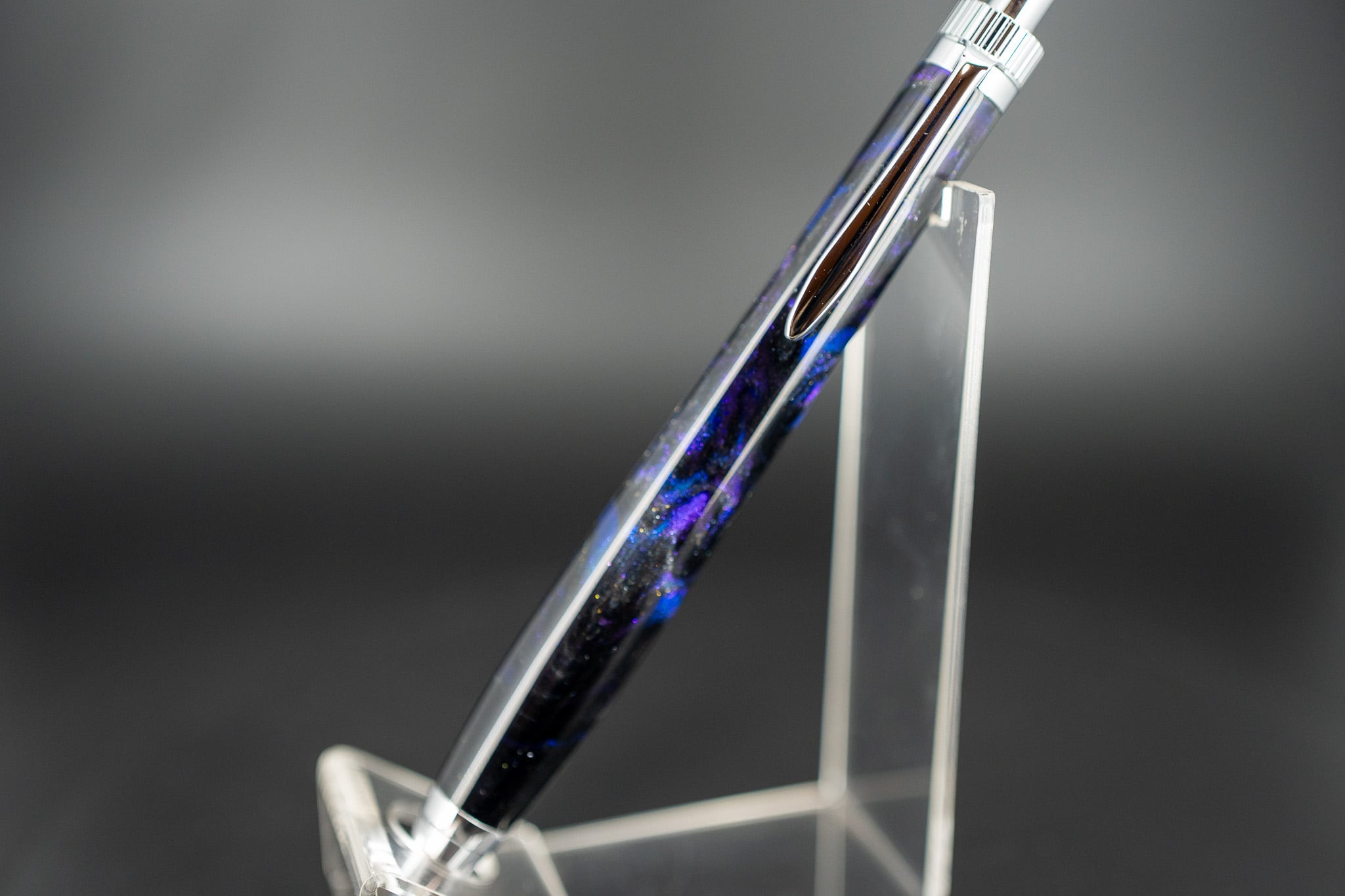 黒をベースに青や紫が複雑にマーブルを描く、煌めく銀河のような一本。