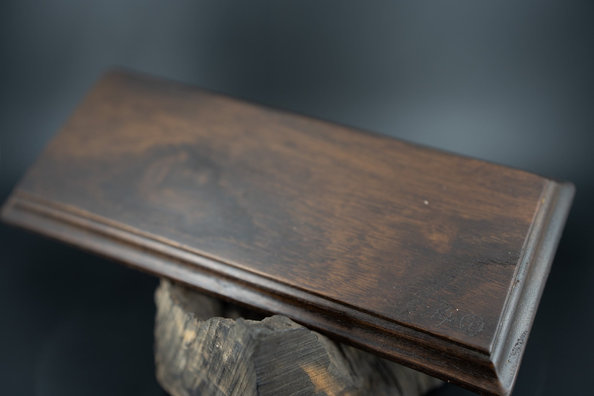 シックな色合いの神代欅に、水面に浮かぶ落葉を木象嵌で表現したコラボアイテム。