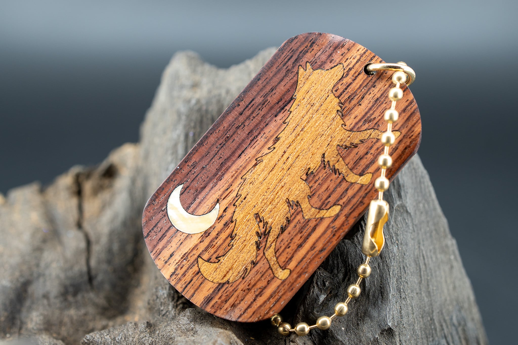 月はグリーンのシェル、オオカミはアカシアの縮み杢で仕立てました。