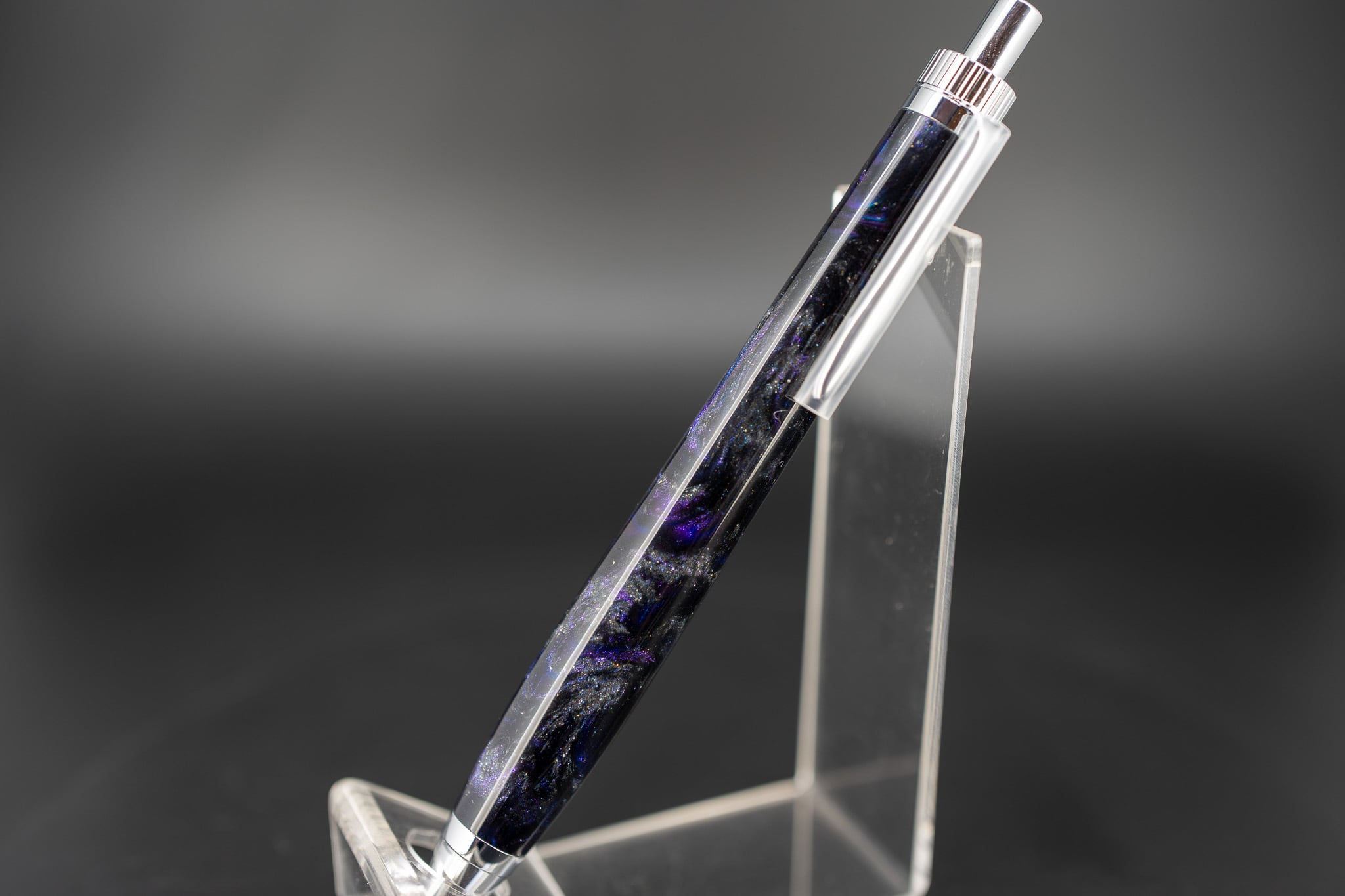 黒をベースにシルバーや紫が複雑にマーブルを描く、煌めく銀河のような一本。