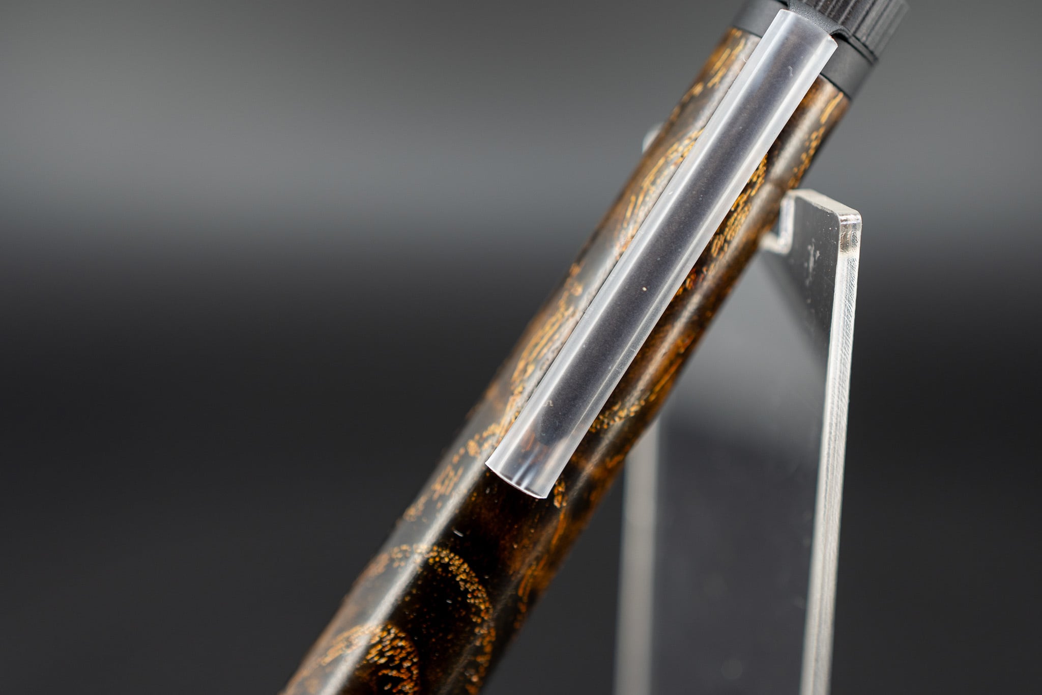 美しい木目のタモに国産漆を丁寧に塗り重ね、導管には金色の顔料を混ぜた漆を摺り込みました。