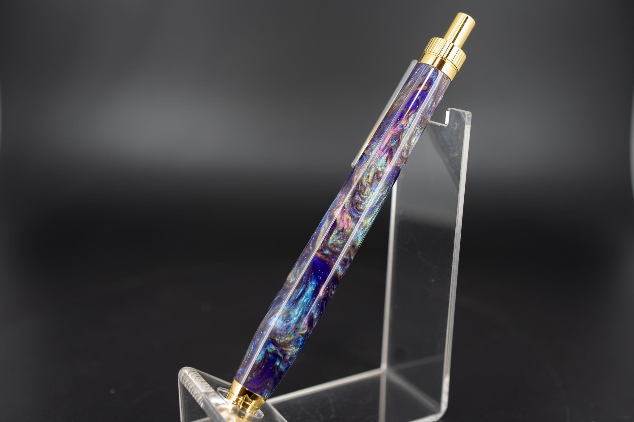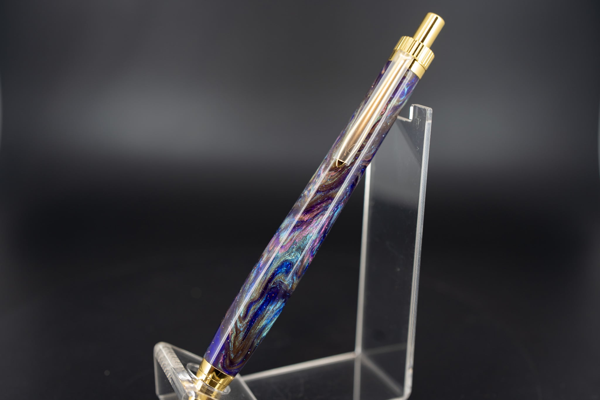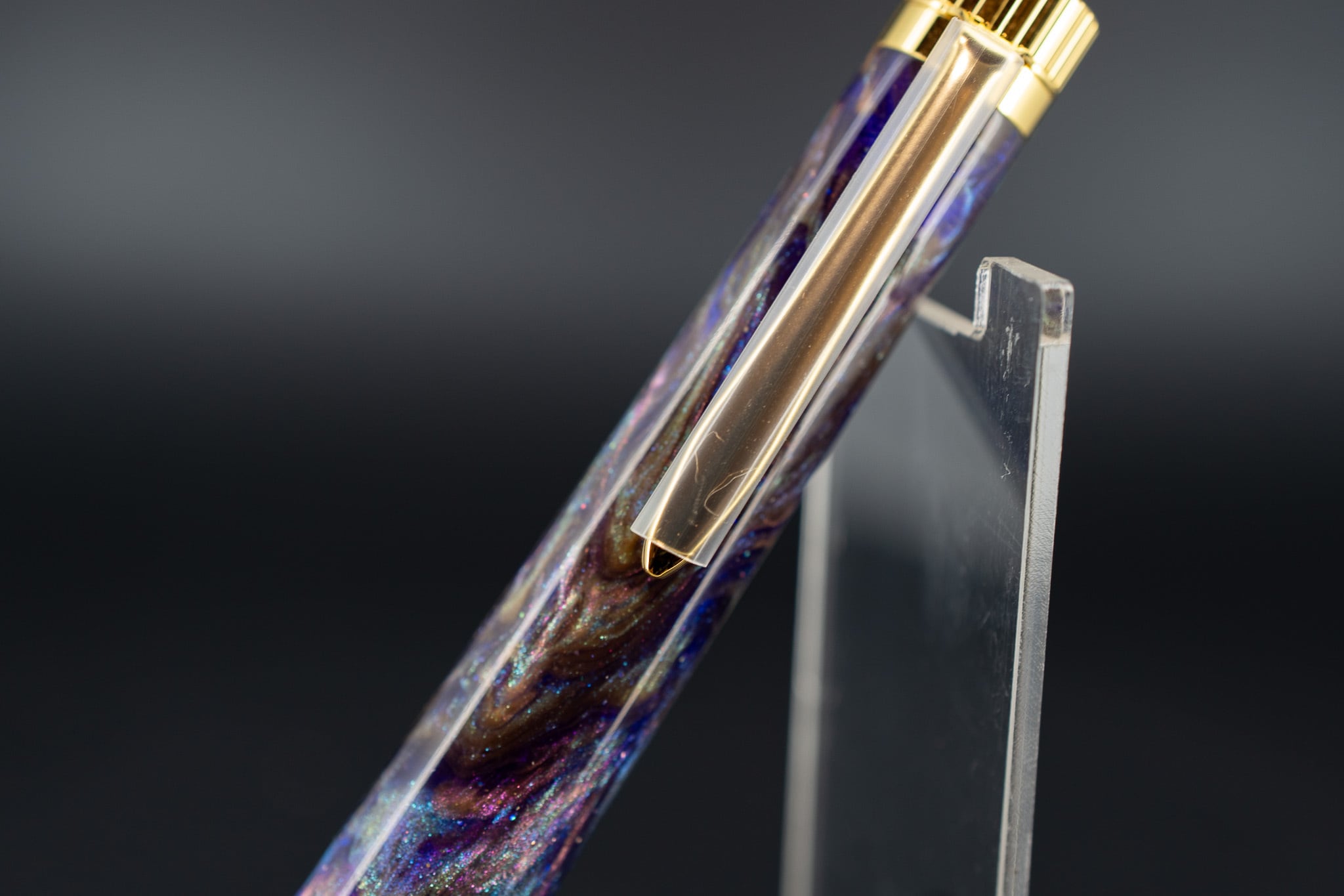紫をベースに緑やオレンジが複雑にマーブルを描く、煌めく銀河のような一本。