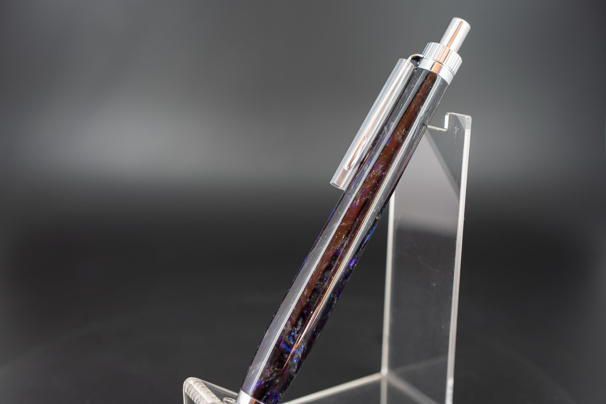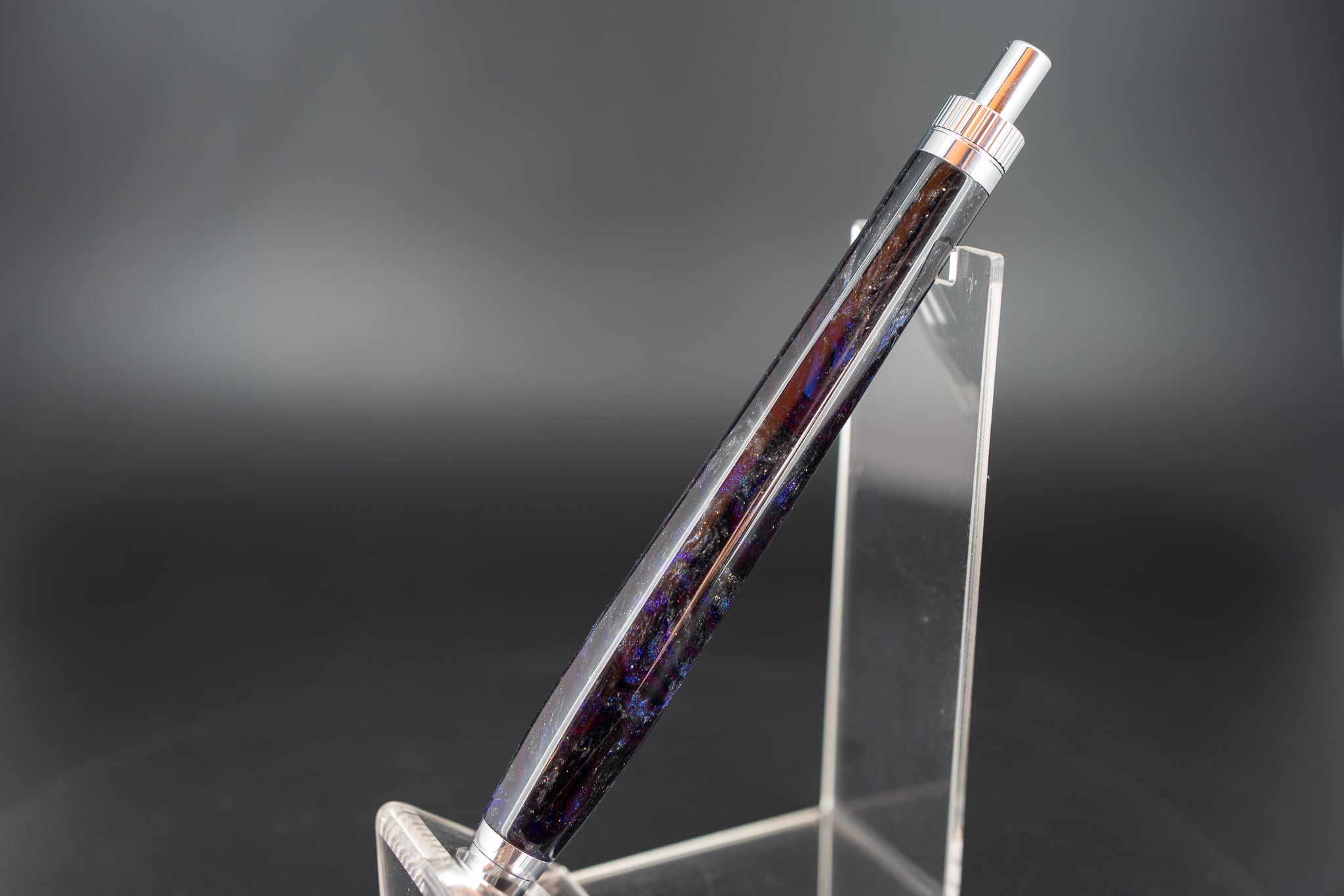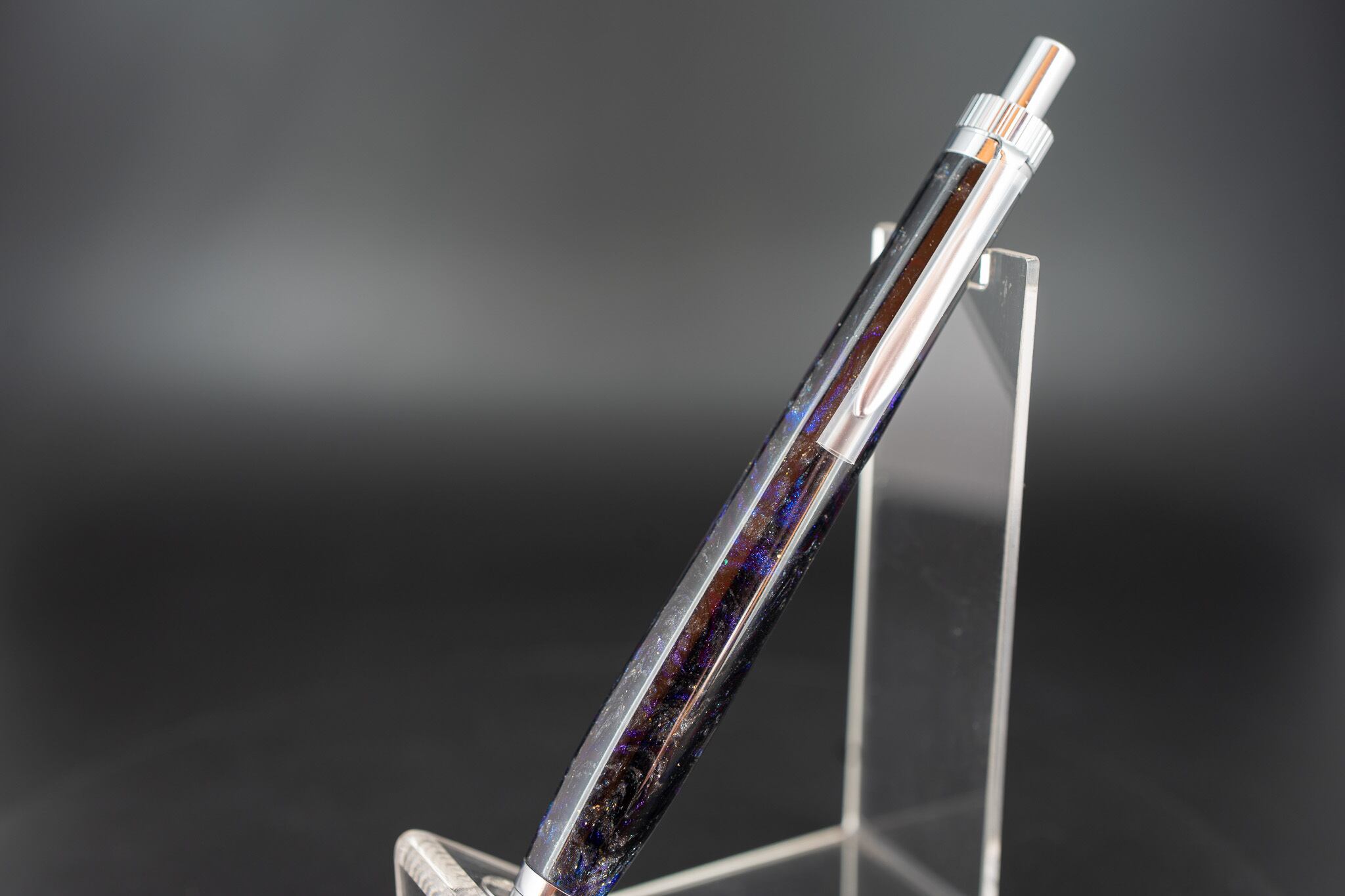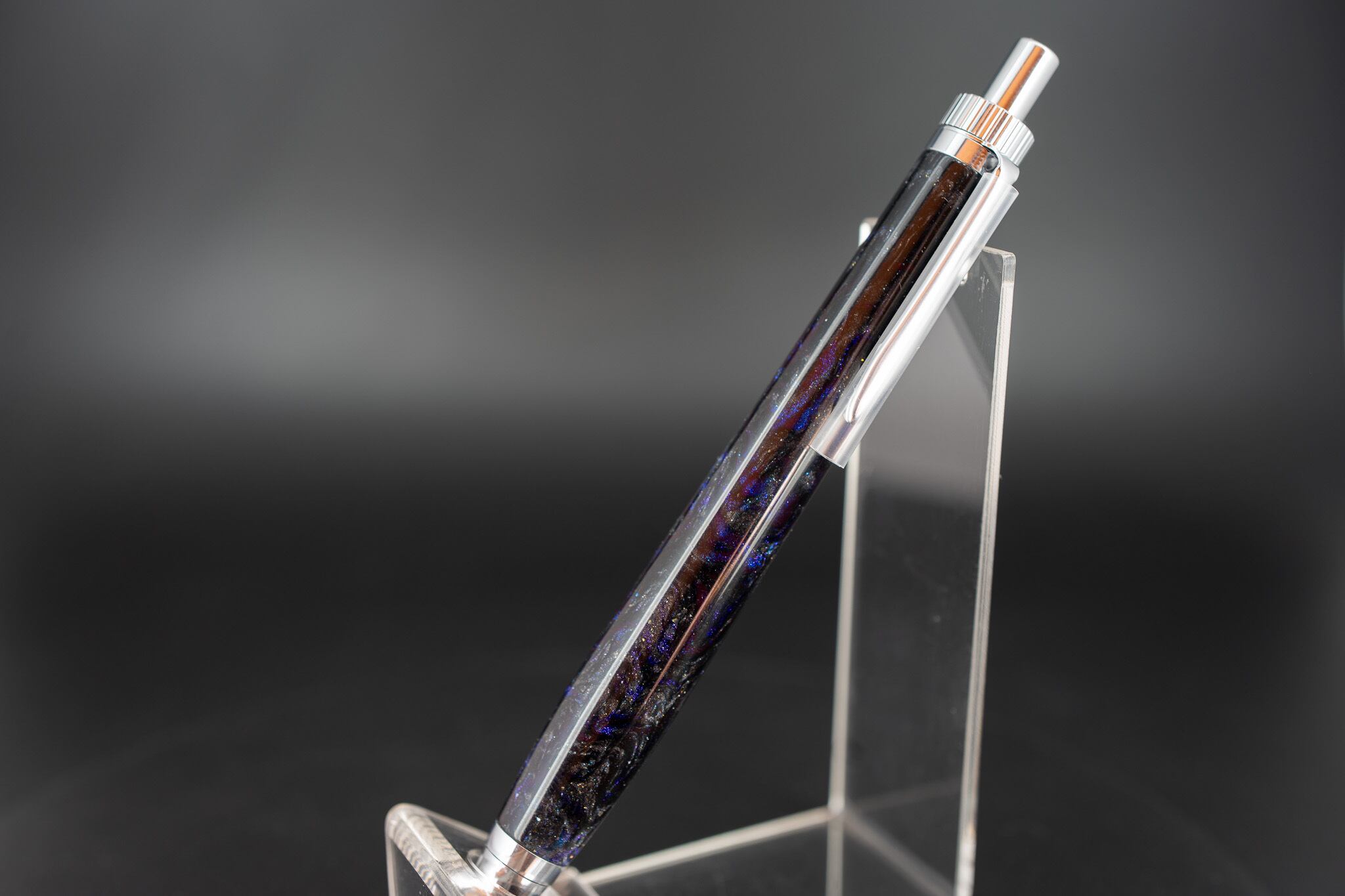 黒をベースに紫やシルバーが複雑にマーブルを描く、煌めく銀河のような一本。