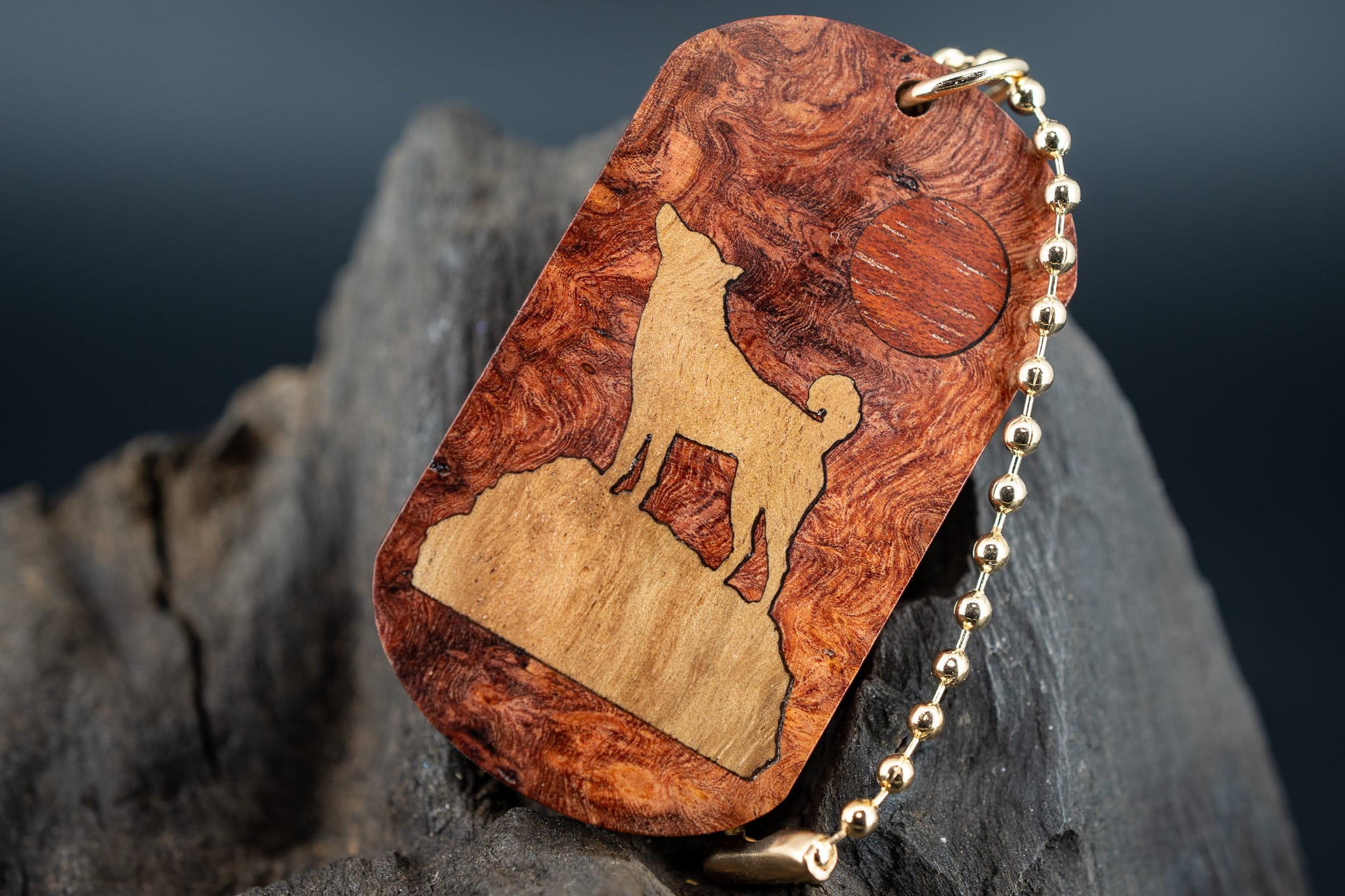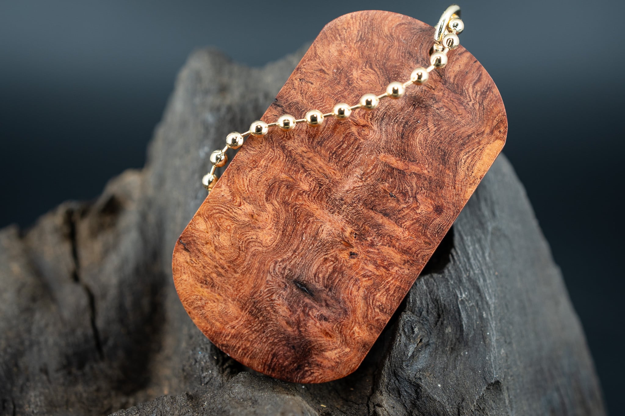 【朱色の銘木】 本花梨瘤 ドッグタグ 象嵌 日の出の丘
