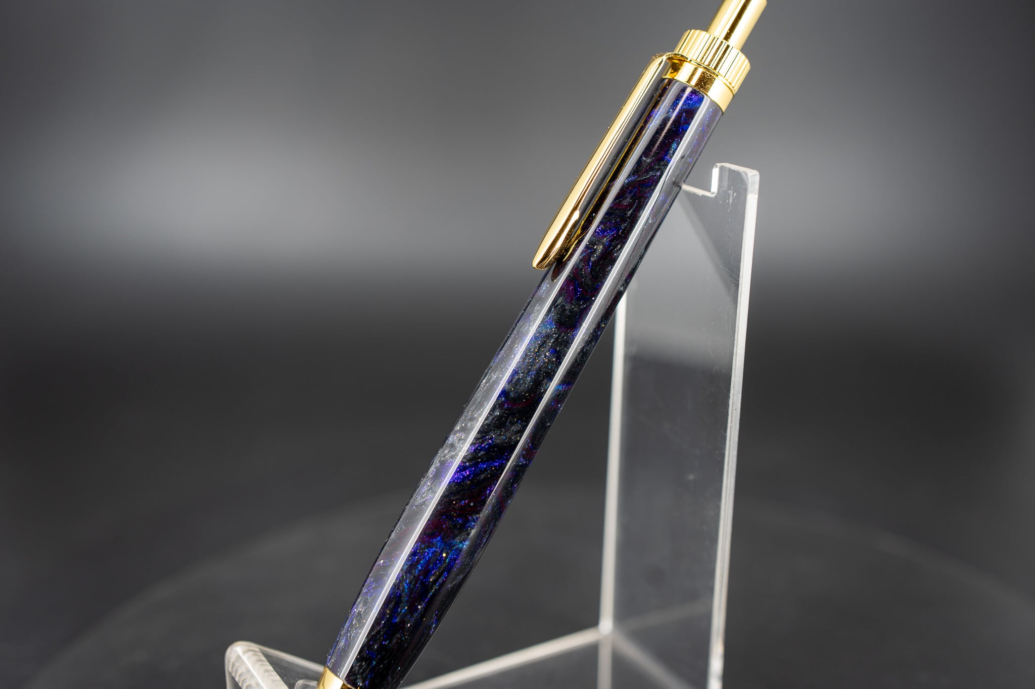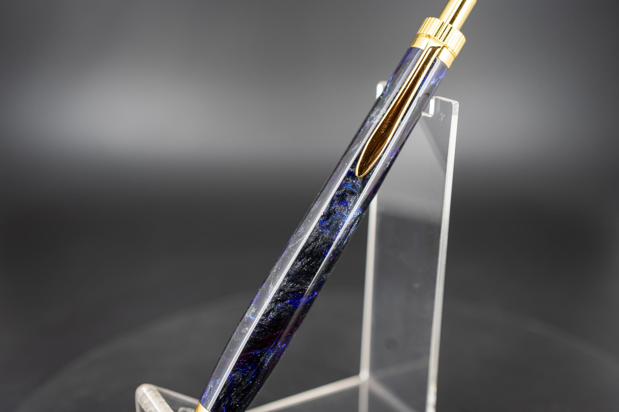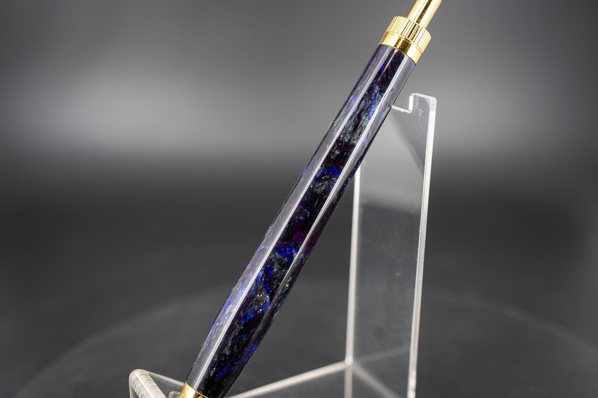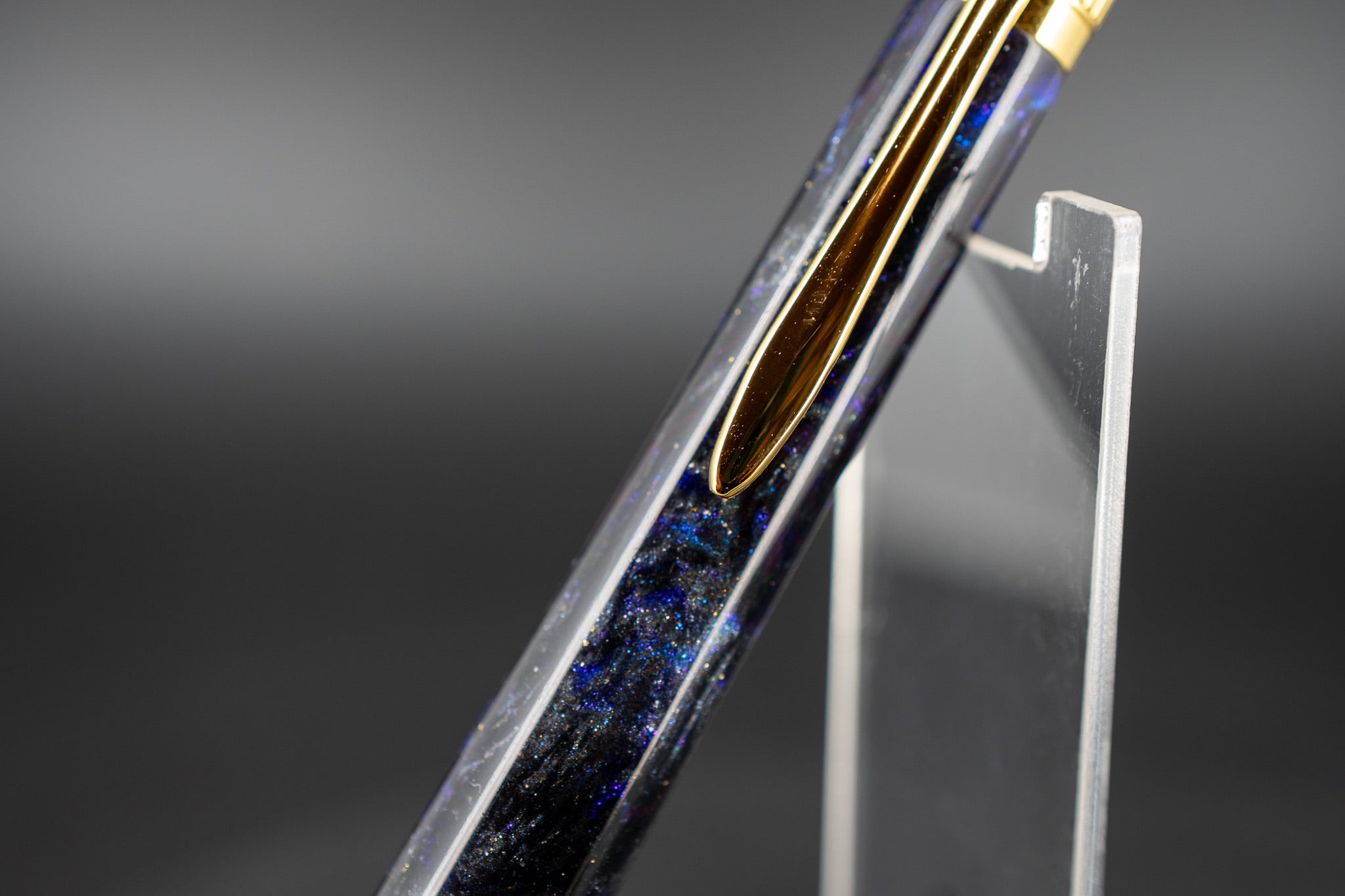 黒をベースに紫やシルバーが複雑にマーブルを描く、煌めく銀河のような一本。