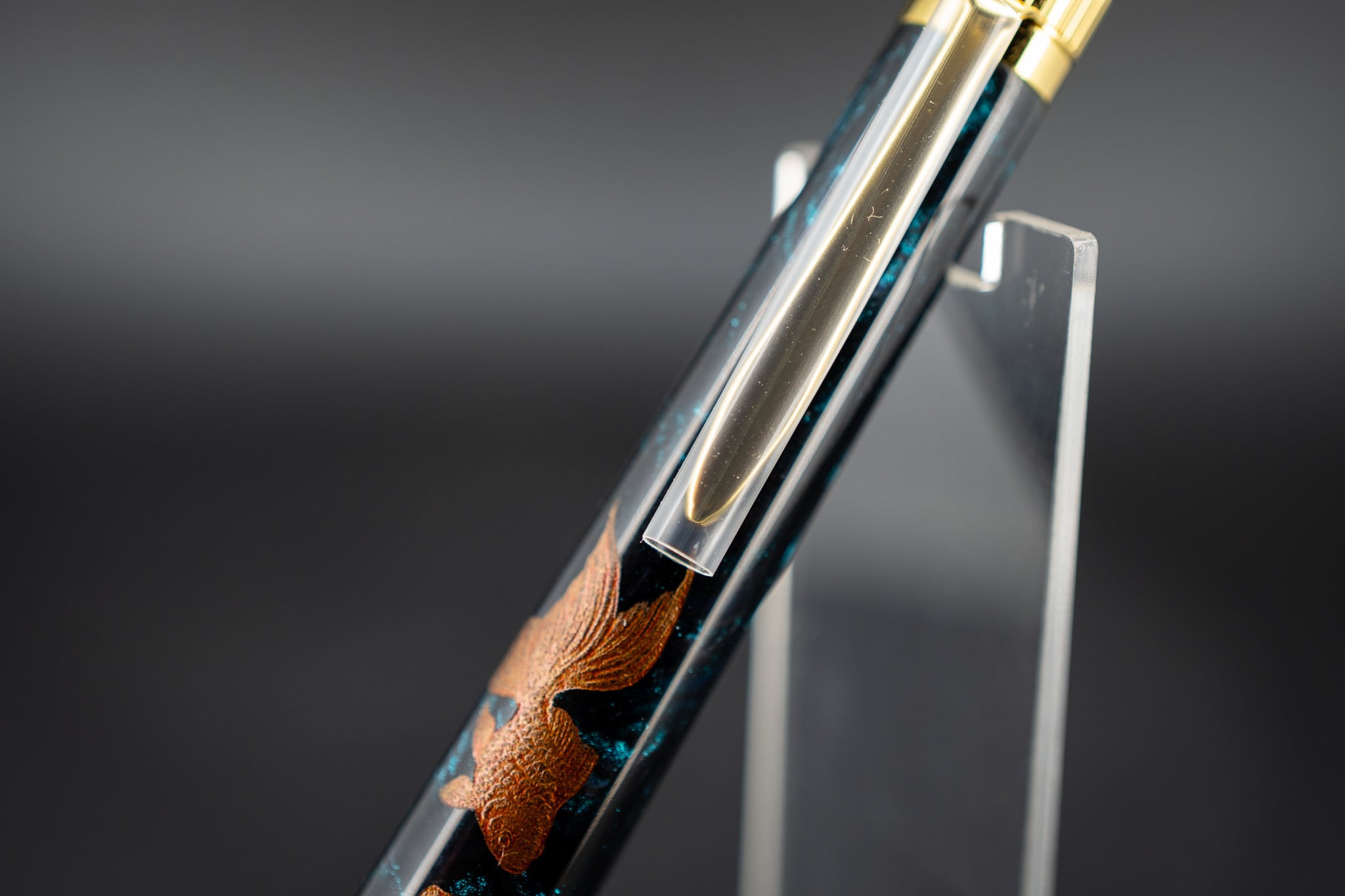 レジン水槽に見立て、水中に浮かぶ金魚を沈金で表現しました。