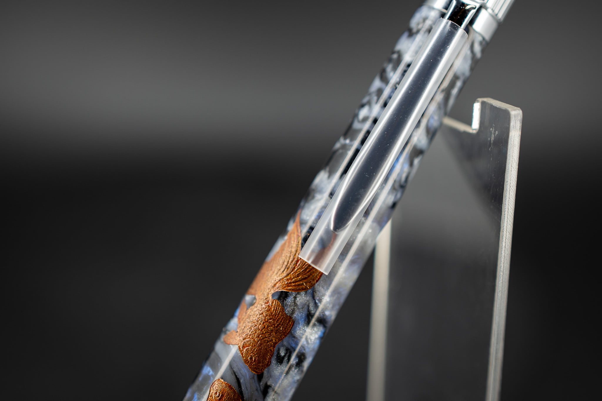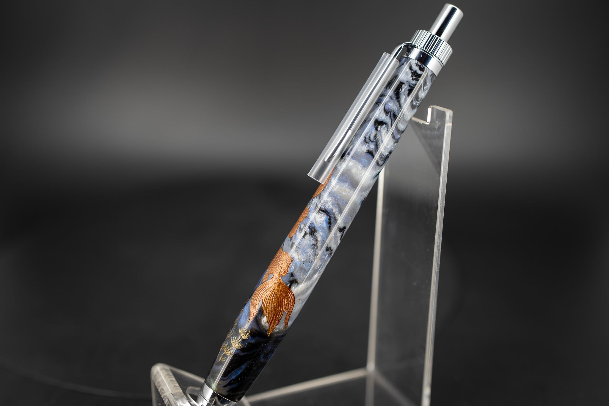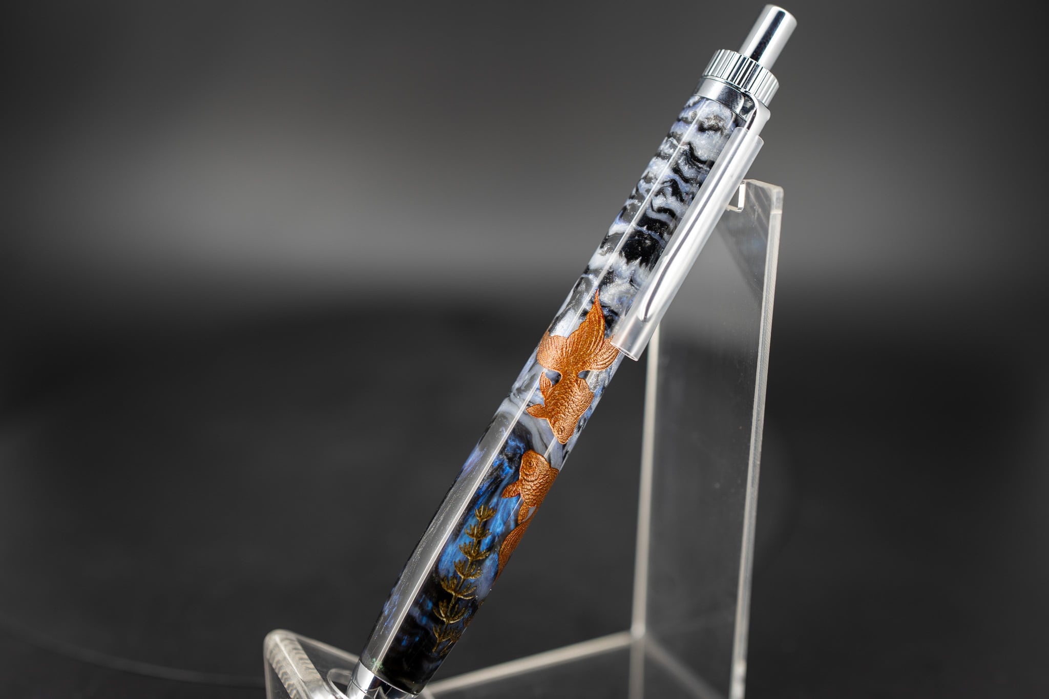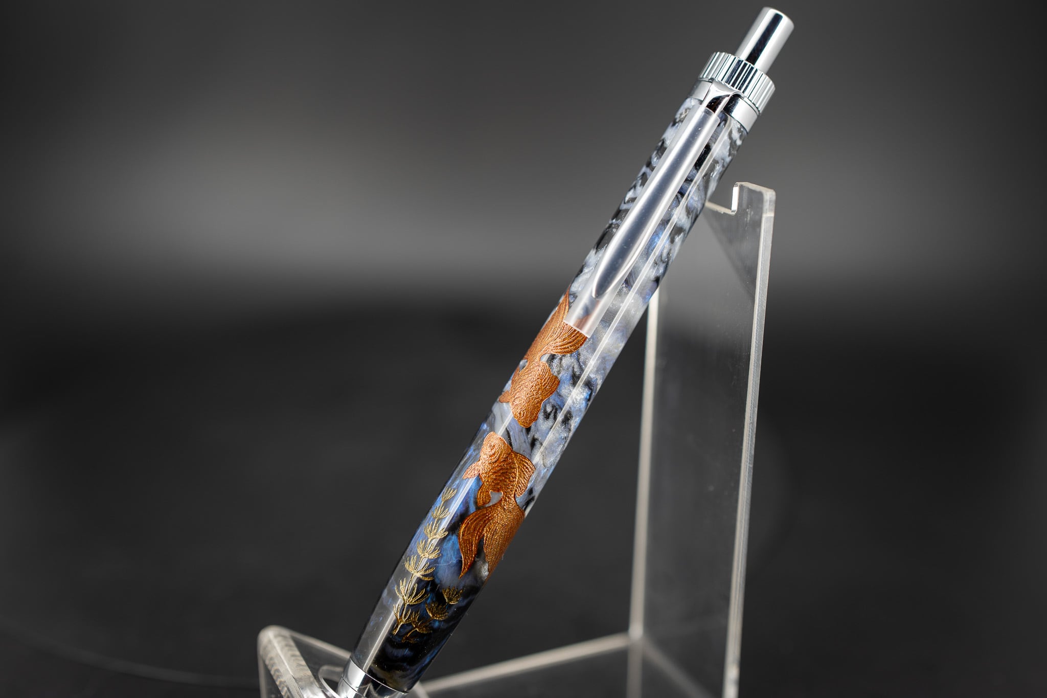 レジン水槽に見立て、水中に浮かぶ金魚を沈金で表現しました。