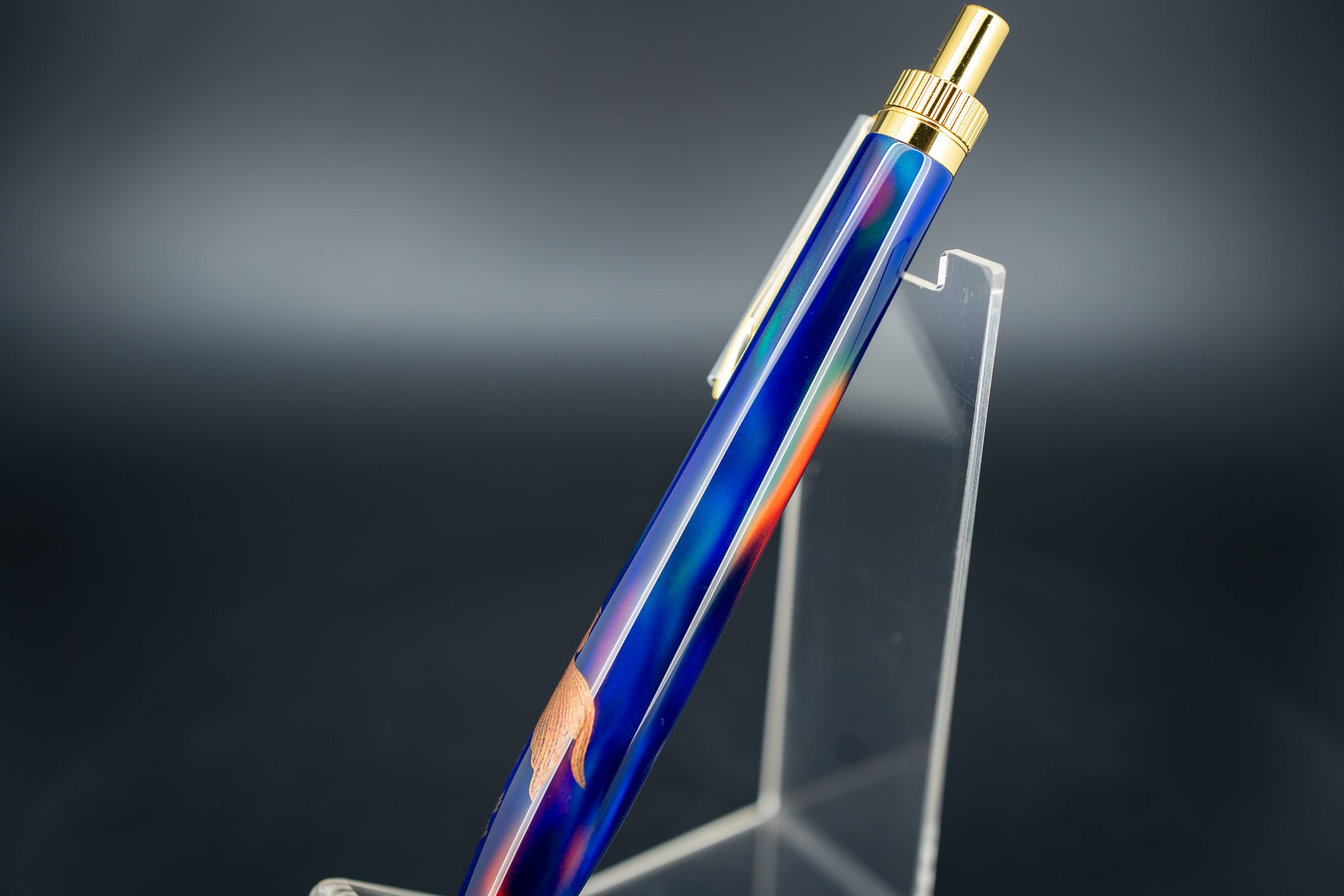 ハイブリッドオパールを水槽に見立て、水中に浮かぶ金魚を沈金で表現しました。