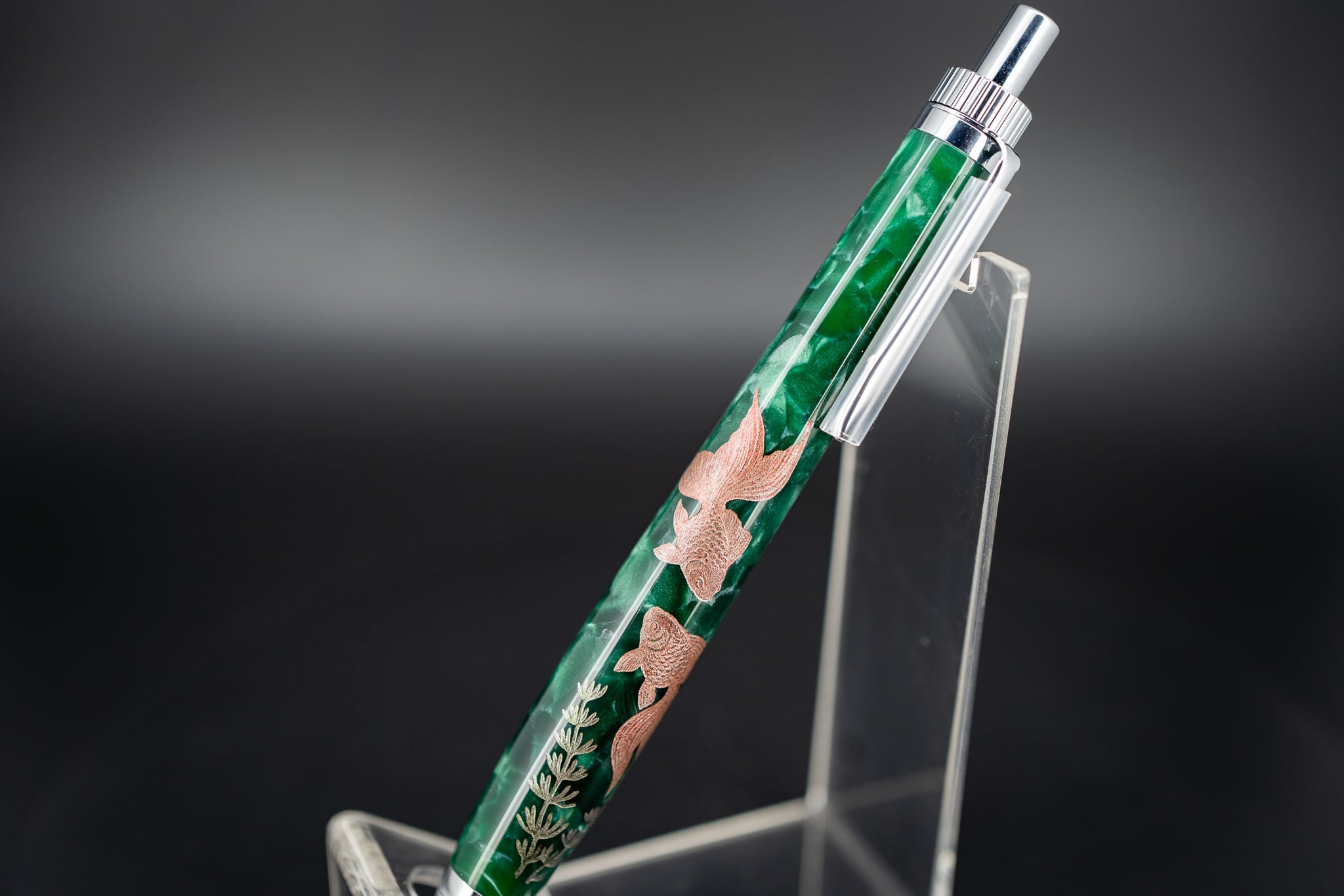 透明感のある軸を水槽に見立て、水中に浮かぶ金魚を沈金で表現しました。