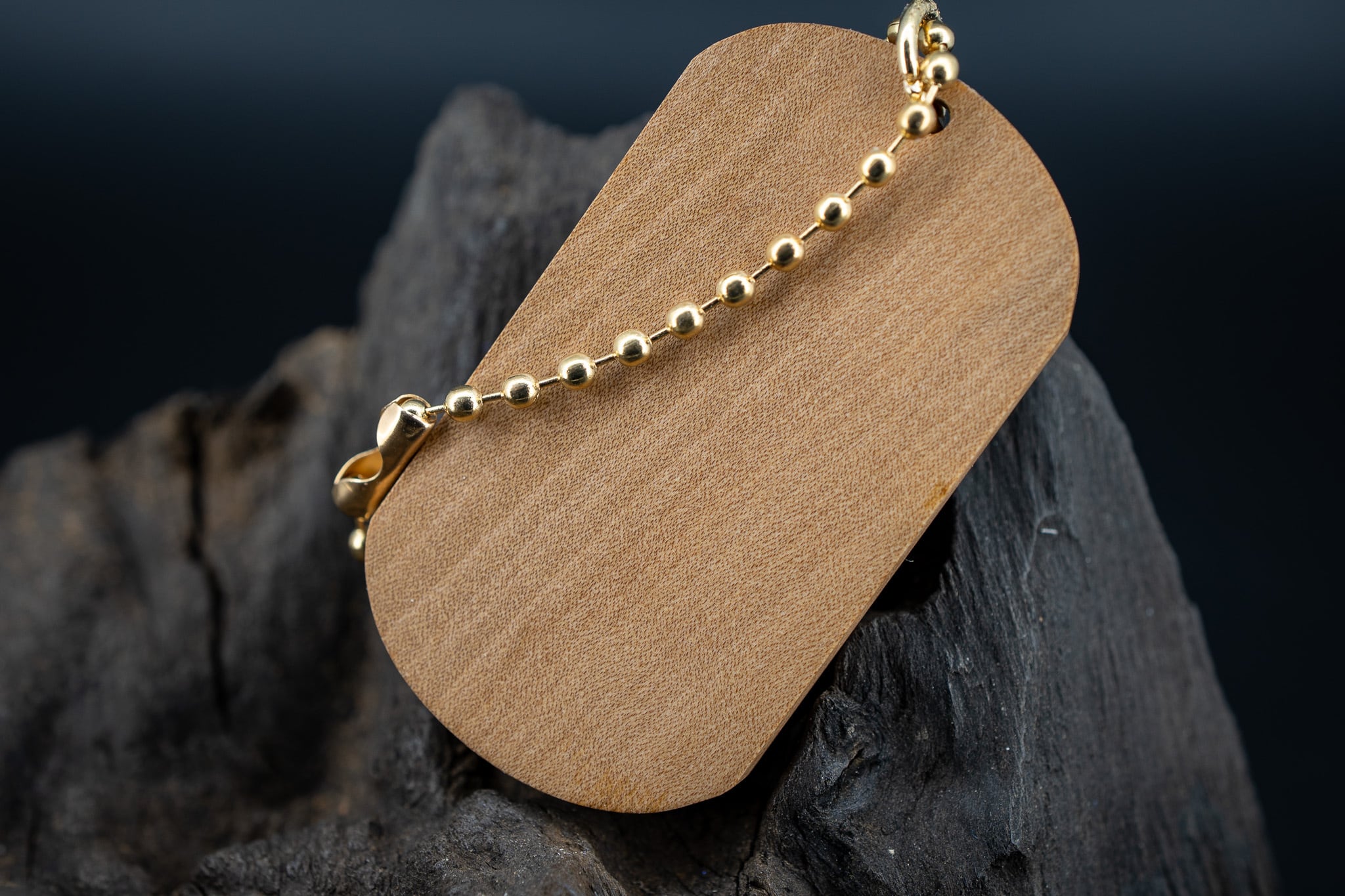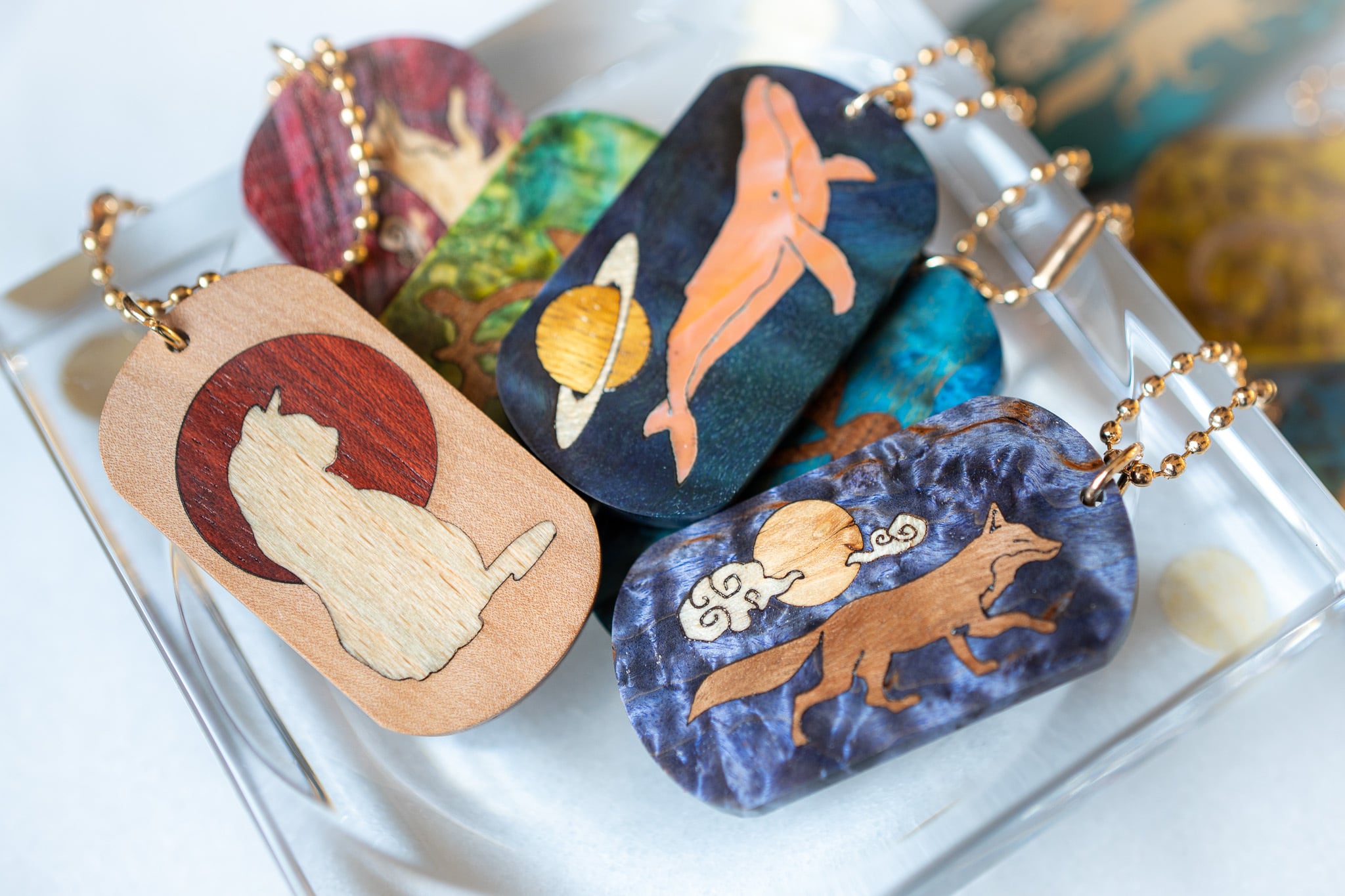 【茶花の女王】椿 ドッグタグ 木象嵌 横を向く上品な猫