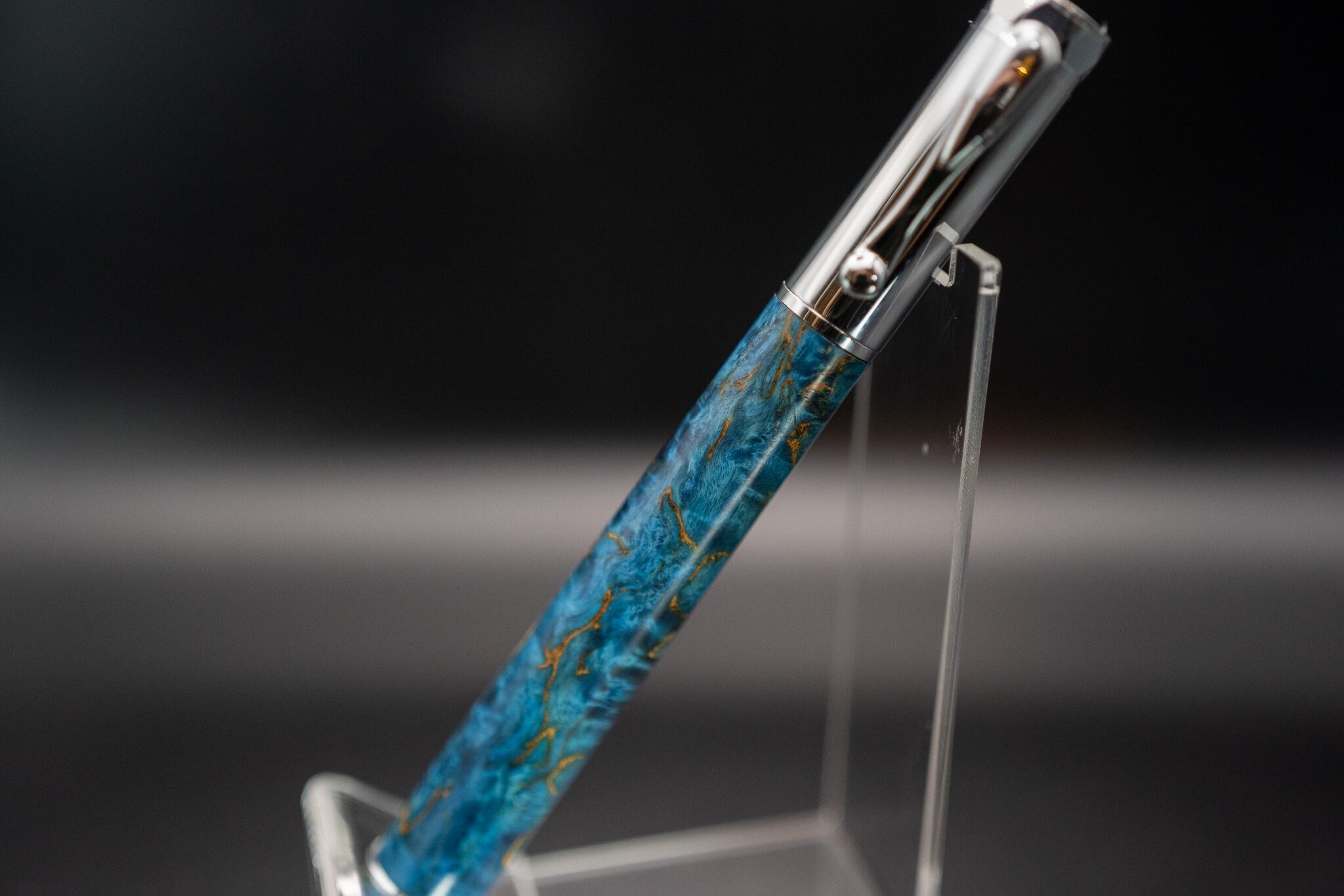 今回の材は特に杢の特徴が強い材に深い青の樹脂を流した逸品。