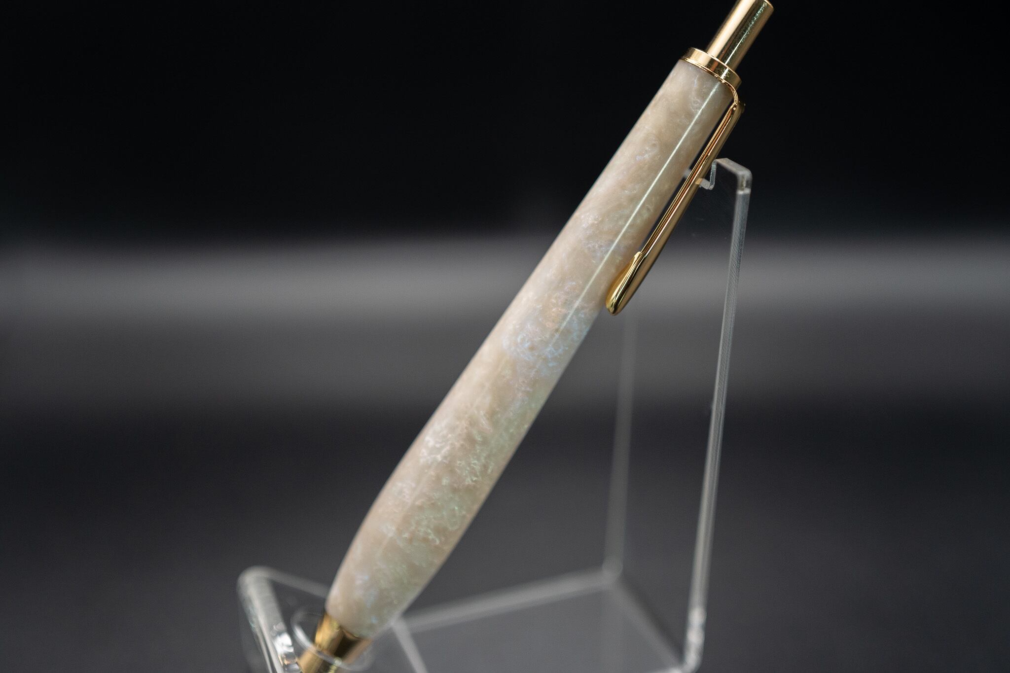 白を基調に遊色が輝く、シェルオパールの様な一本。写真では表現が難しい、光りの階層があります。