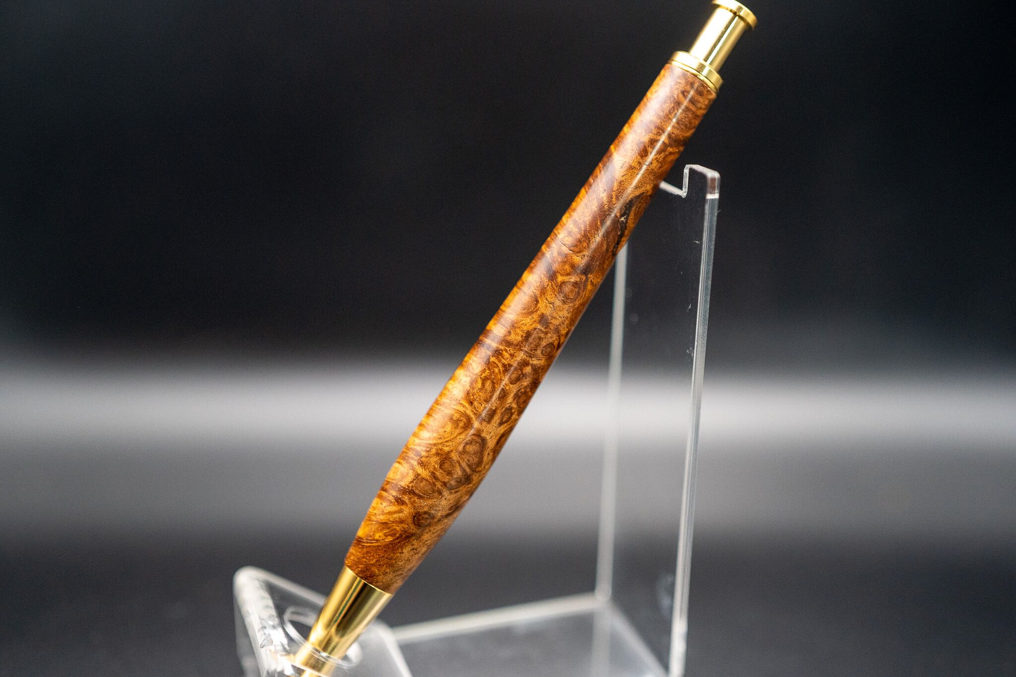 非常に脆く、繊細な瘤材であるアカシアバール。近年樹脂を流して材の強度を上げるスタビライズドウッドの登場によりペン用の材として利用が出来るようになりました。元々産出量も少なく、クラックも多い扱い非常に難しい材。