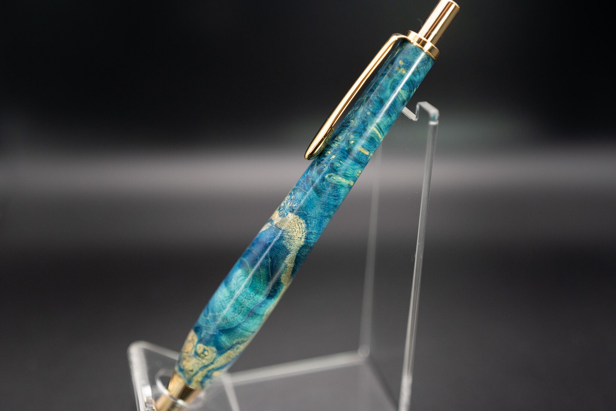 こちらはメープルバールに爽やかな水色や青の樹脂を流して染め上げたスタビライズドウッド。メープルの白色の部分と相まり、砂浜とサンゴ礁を閉じ込めた様。