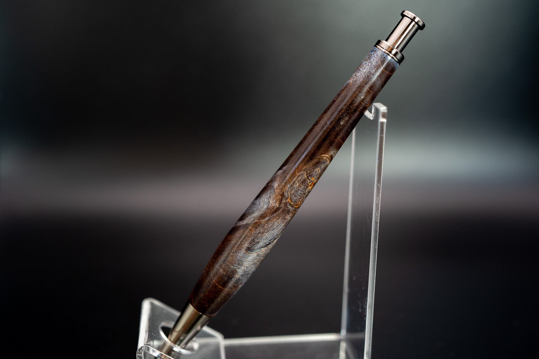 深みのある黒系に角度によって鮮やかな水色が現れる作品。瘤材ならではの茶色が軸に深みを与えている。