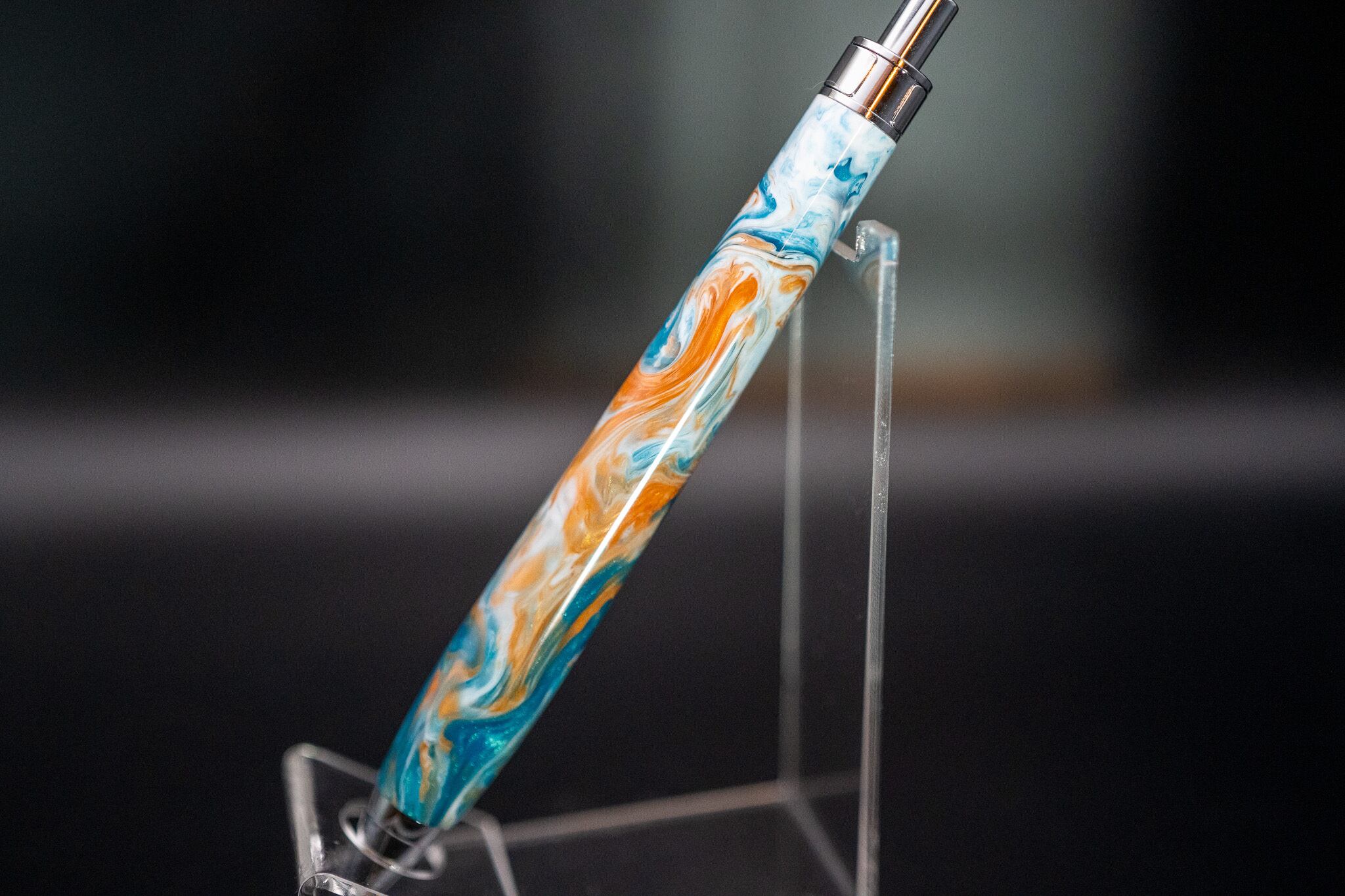 シアーな水色と爽やかな白、アクセントに入るオレンジは美しく、デザイン性の高い一本。