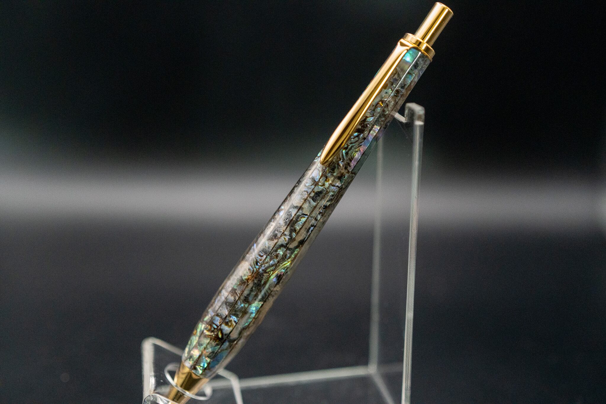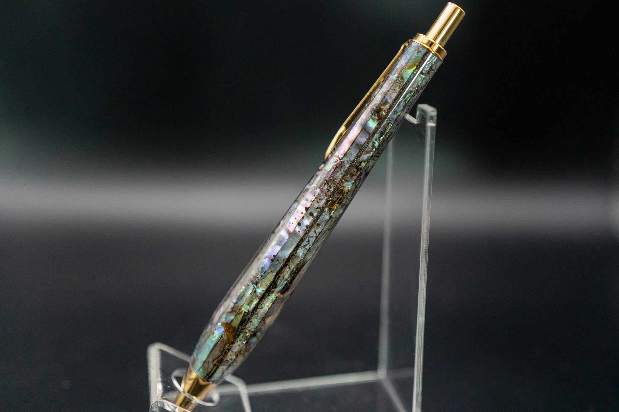 こちらはメキシコ原産のアバロンを2㎜幅にカットし、樹脂で閉じ込めました。