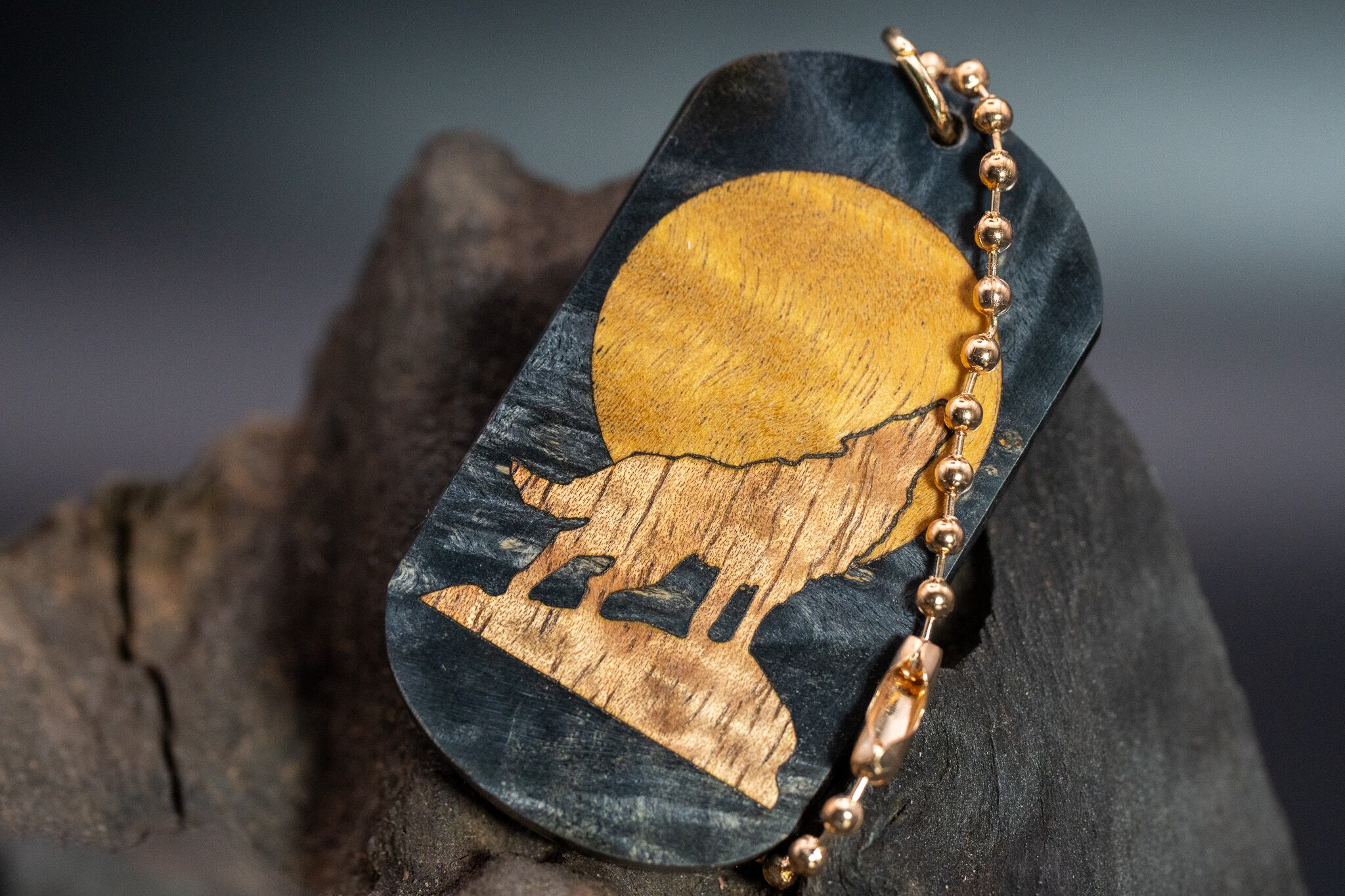 ※【カナダの象徴】 メープルバール スタビライズウッド ドッグタグ 象嵌 月と狼