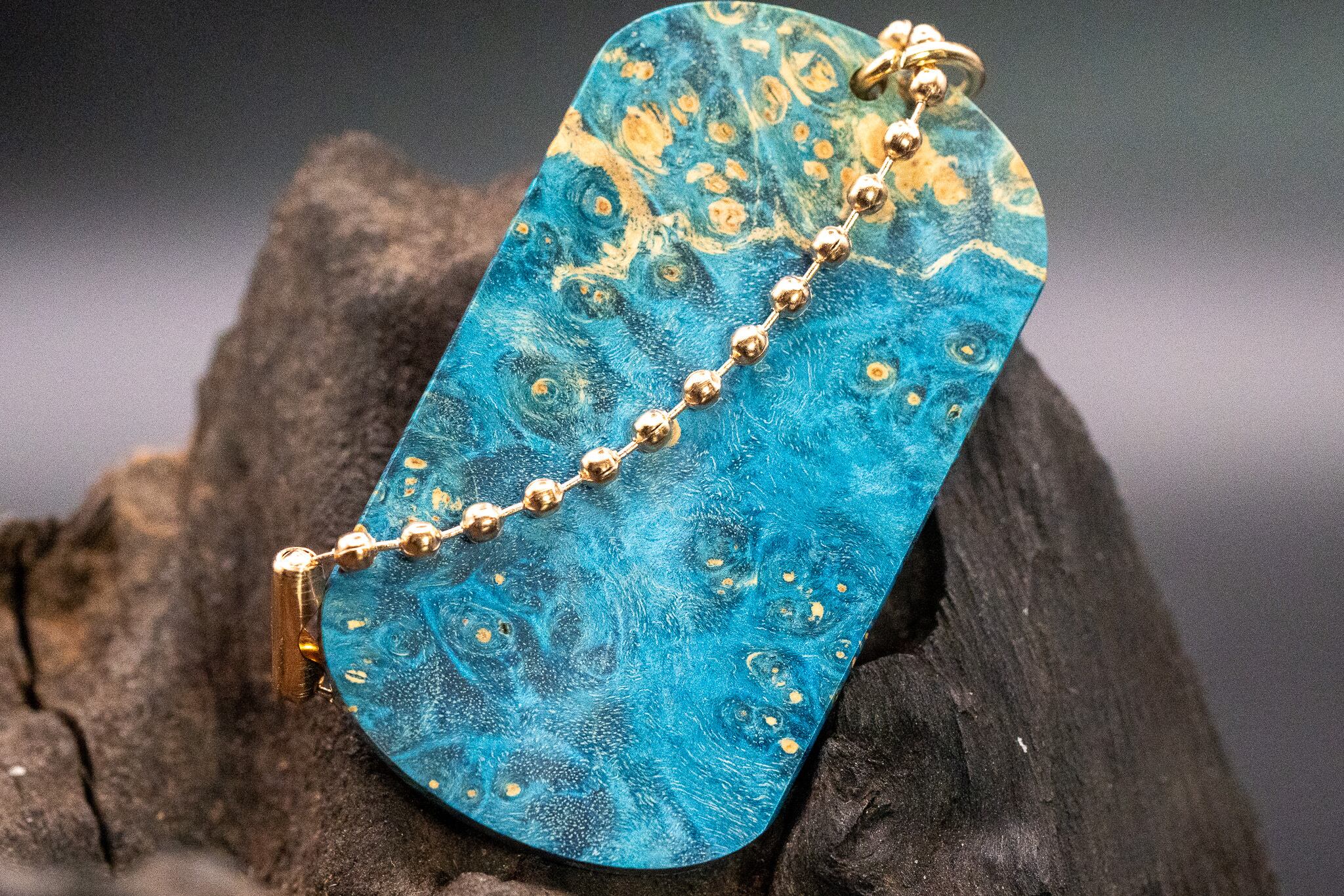 材はメープルに空色の特殊な樹脂を流し固定化させた、スタビライズドウッド。