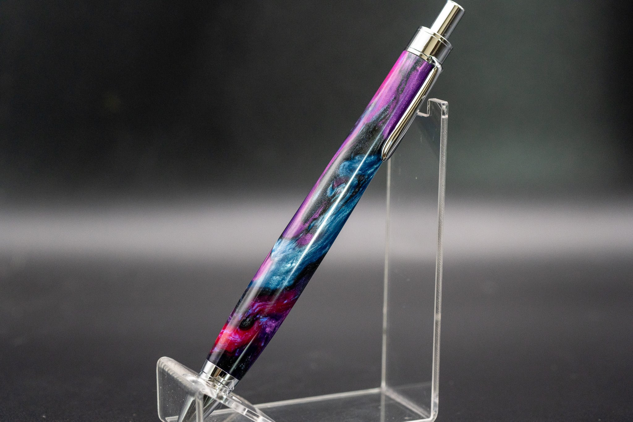 紫と青がきらめき混ざり合う、まるで銀河を閉じ込めたような作品。