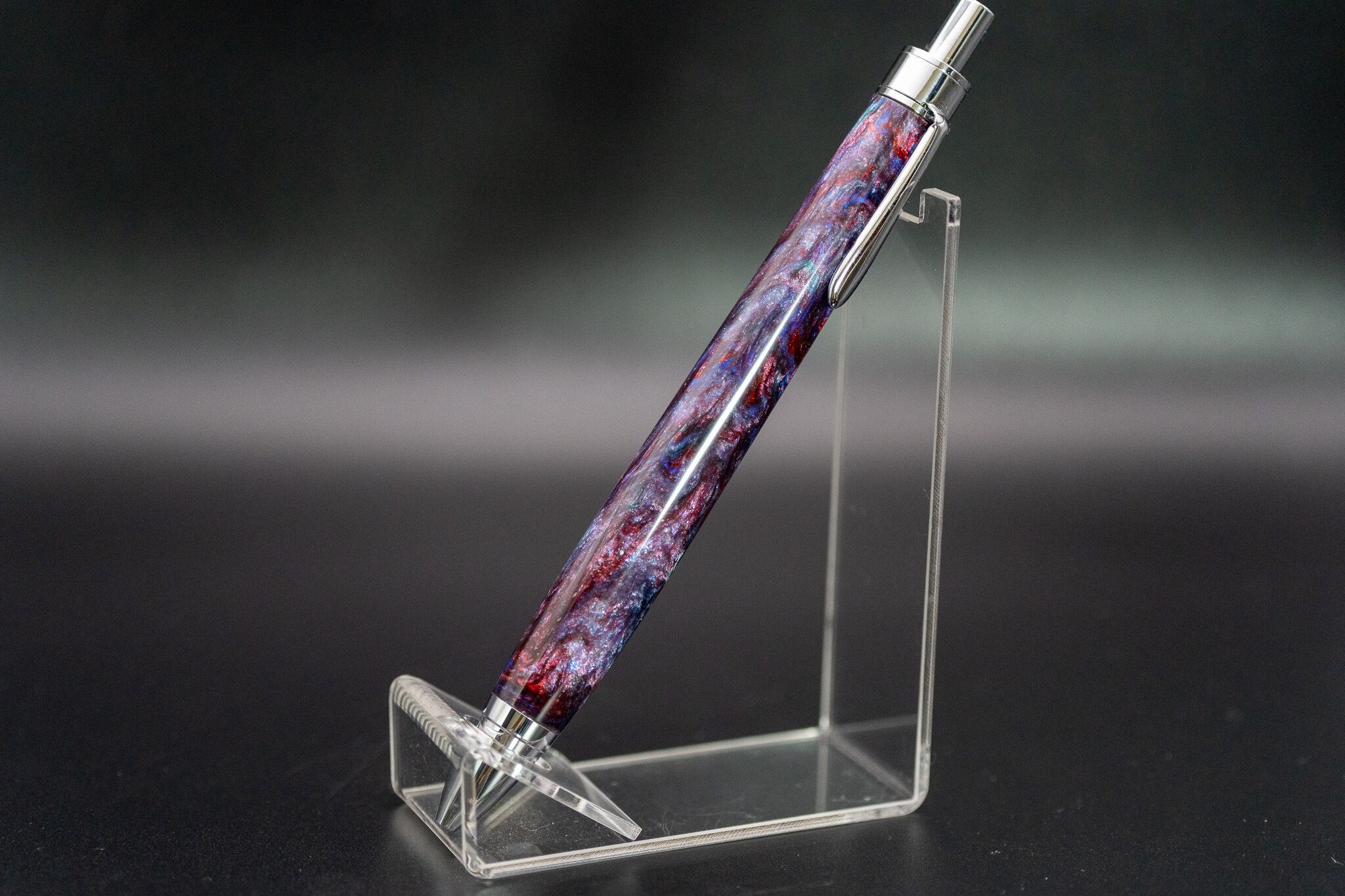 紫と青がきらめき混ざり合う、まるで銀河を閉じ込めたような作品。