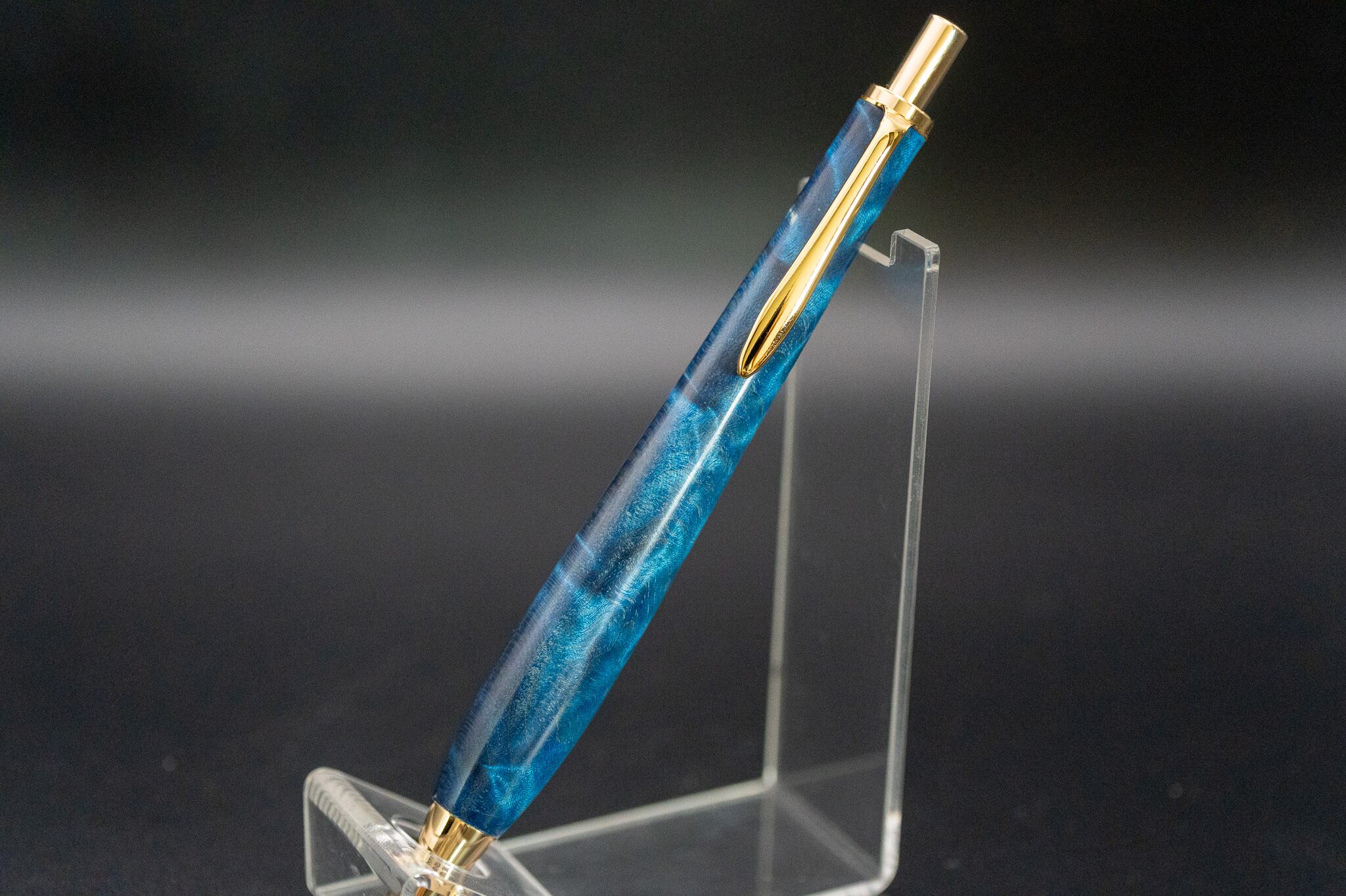 こちらは、ハードメープルに鮮やかな青色の樹脂で染色した一本。