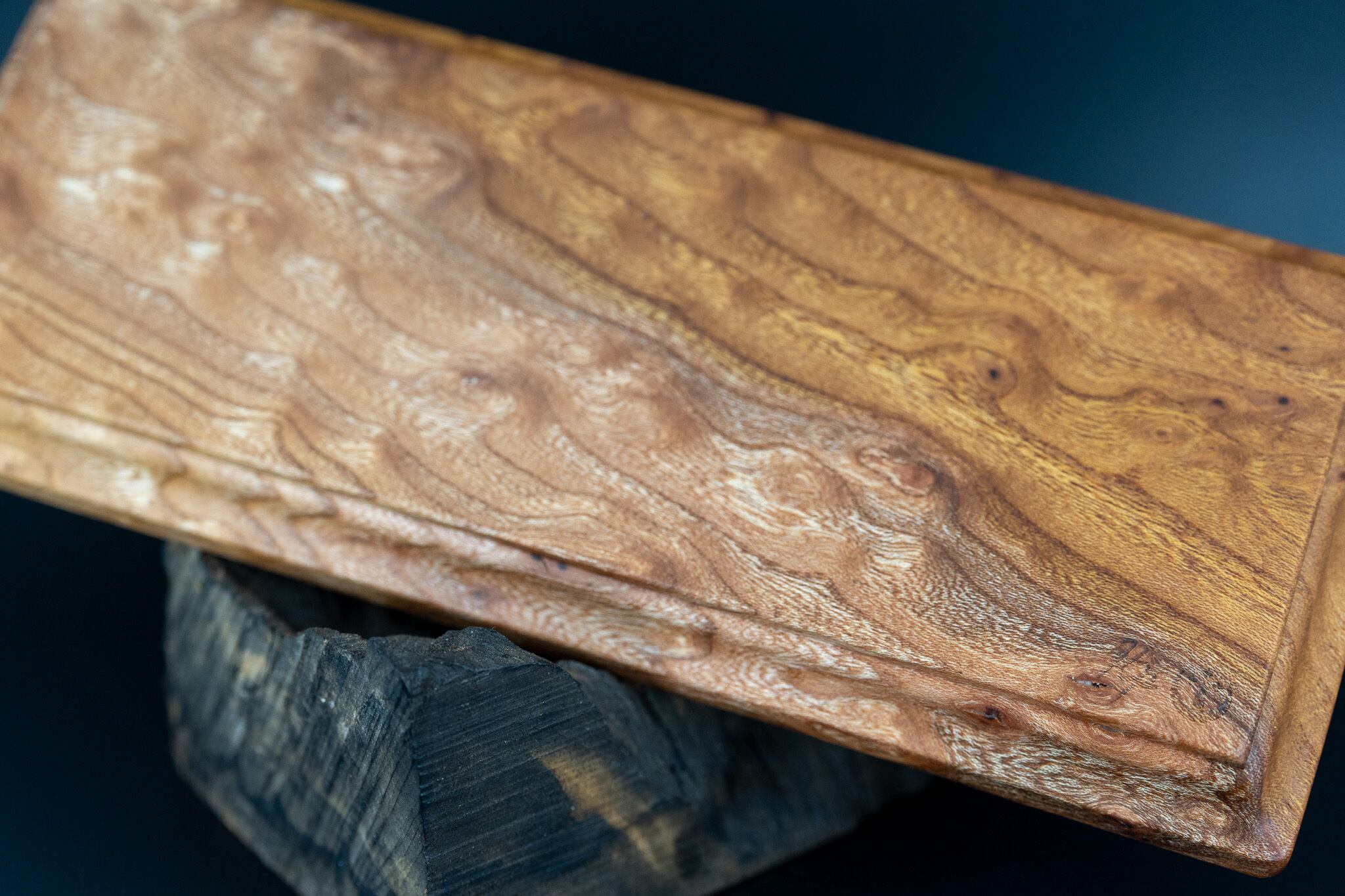 華やかな杢目の現れた欅のトレイに、月夜に吠える狼たちを木象嵌で表現したコラボアイテム。