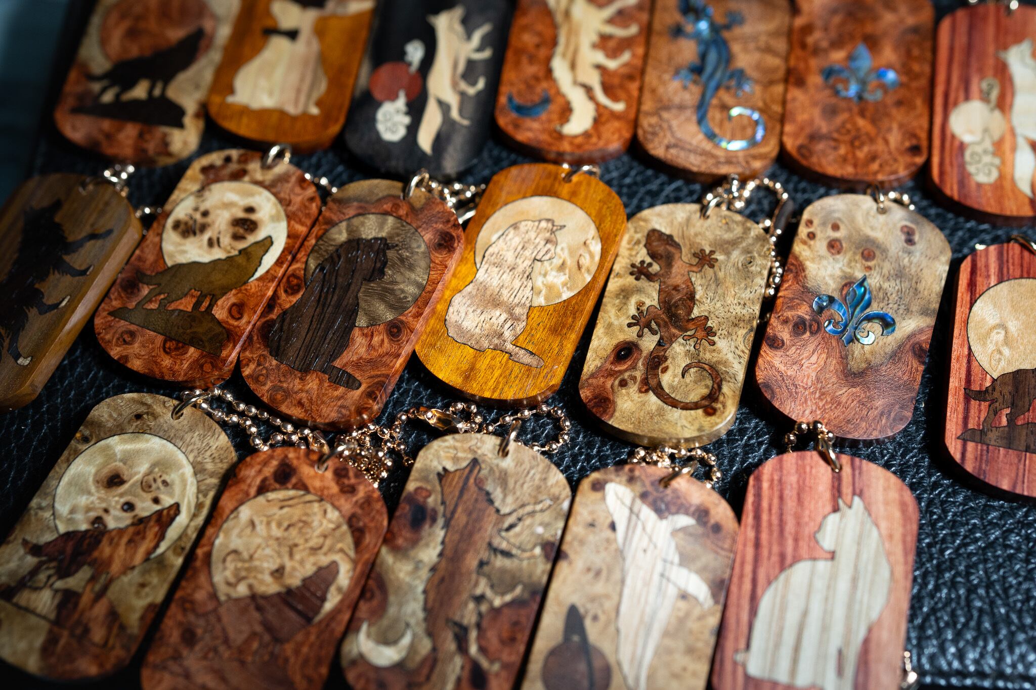 【朱色の銘木】 本花梨瘤 紅白 ドッグタグ 象嵌 月と狼