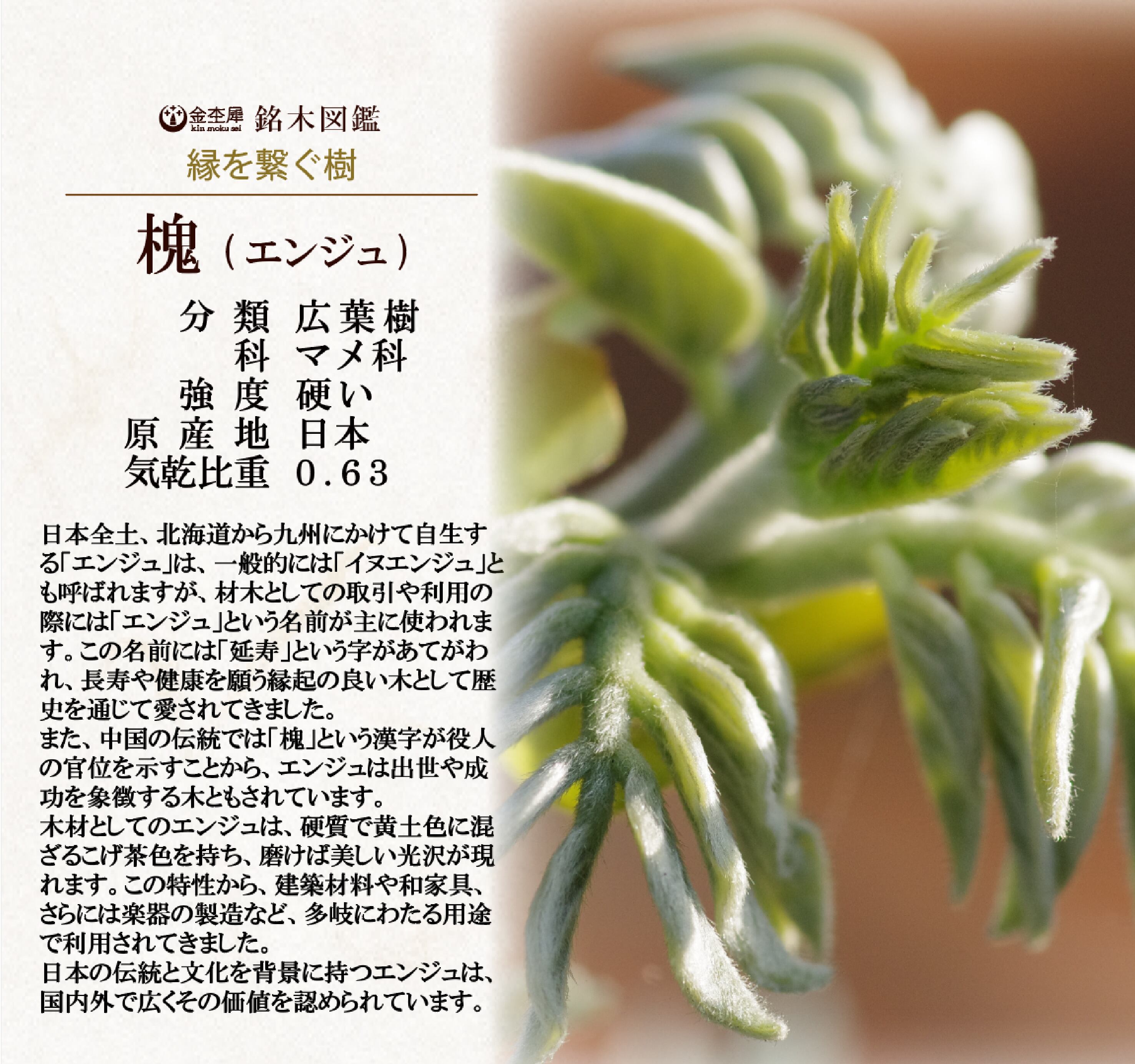 槐(えんじゅ)の名前から、えんじゅ=延寿(長生き)・縁授(縁を授かる)の意味もある縁起物。