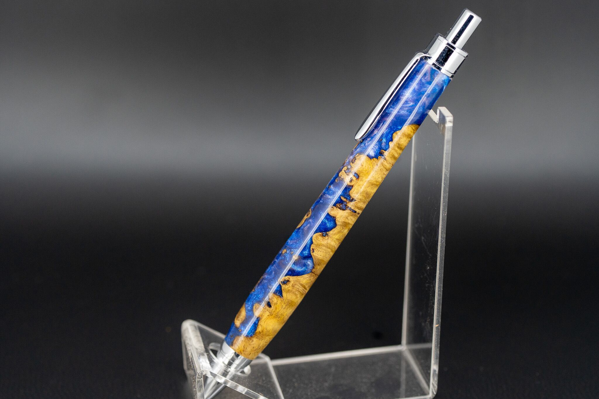 複雑な木目の瘤材に、煌めく紫のレジンが華やかに映える一本。