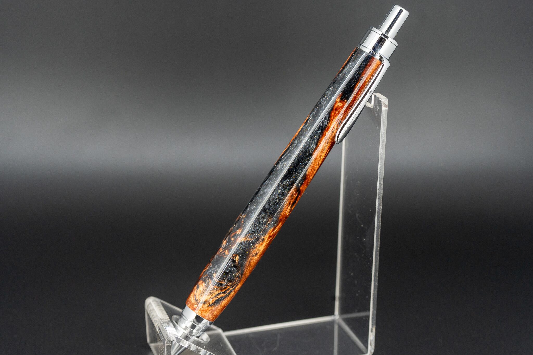 オレンジとシルバーがかった黒のマーブルが華やかな一本。