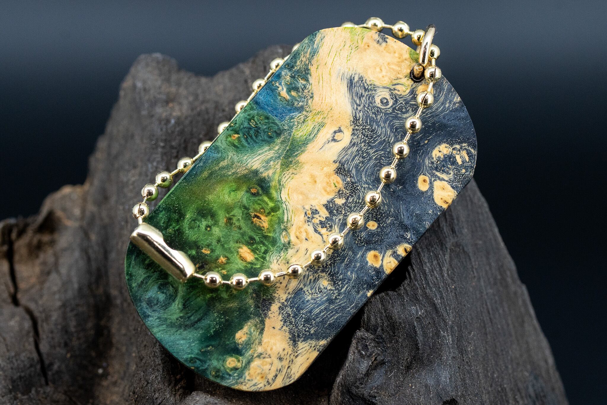 材はメープルバールに緑と青の特殊な樹脂を流し固定化させた、スタビライズドウッド。