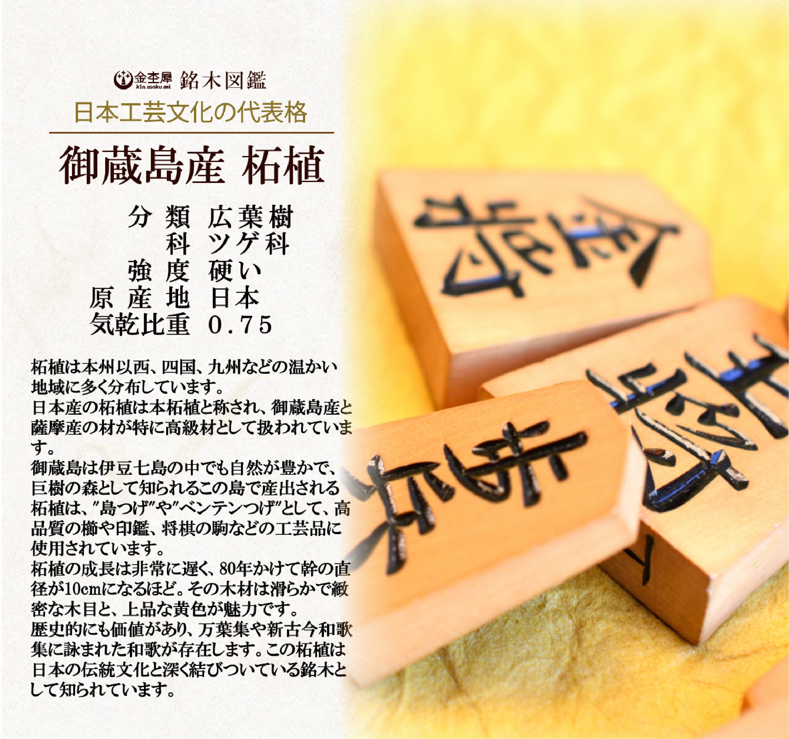 中でも鹿児島県産の薩摩柘植(さつまつげ)、伊豆七島御蔵島産の御蔵柘植が最高峰の産地として名高く、将棋の駒や櫛など、いずれも最高級の工芸品に利用されています。
